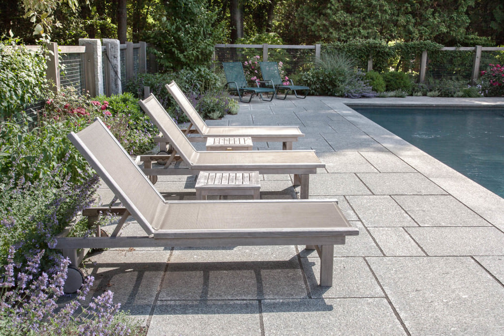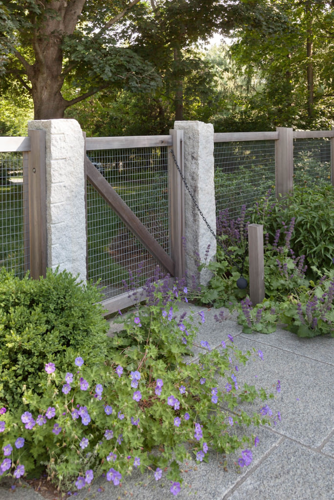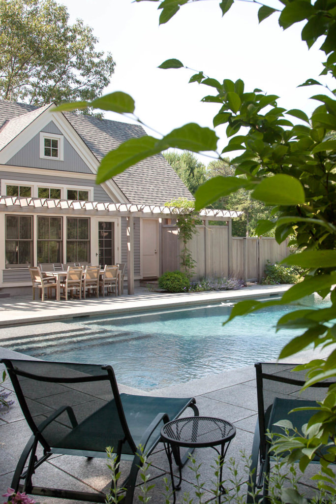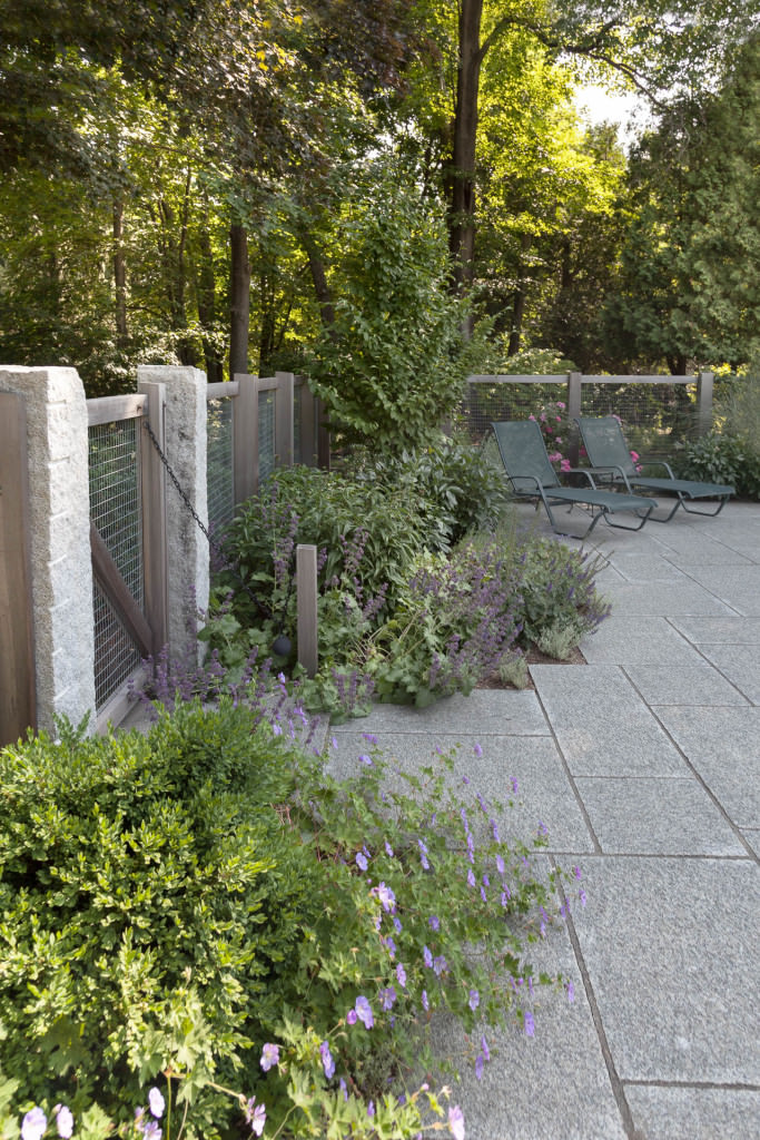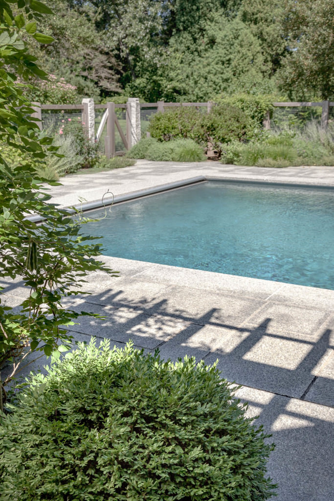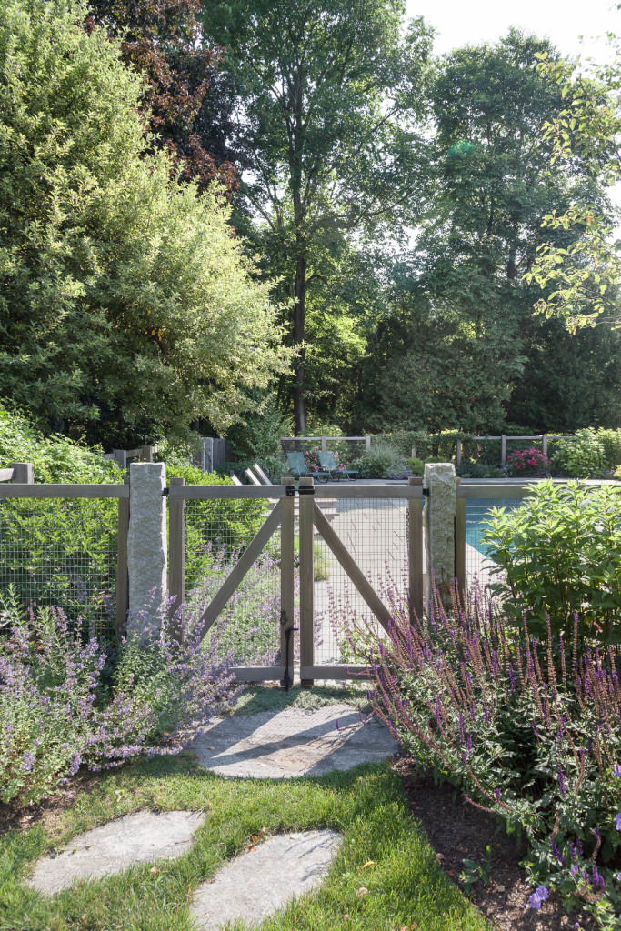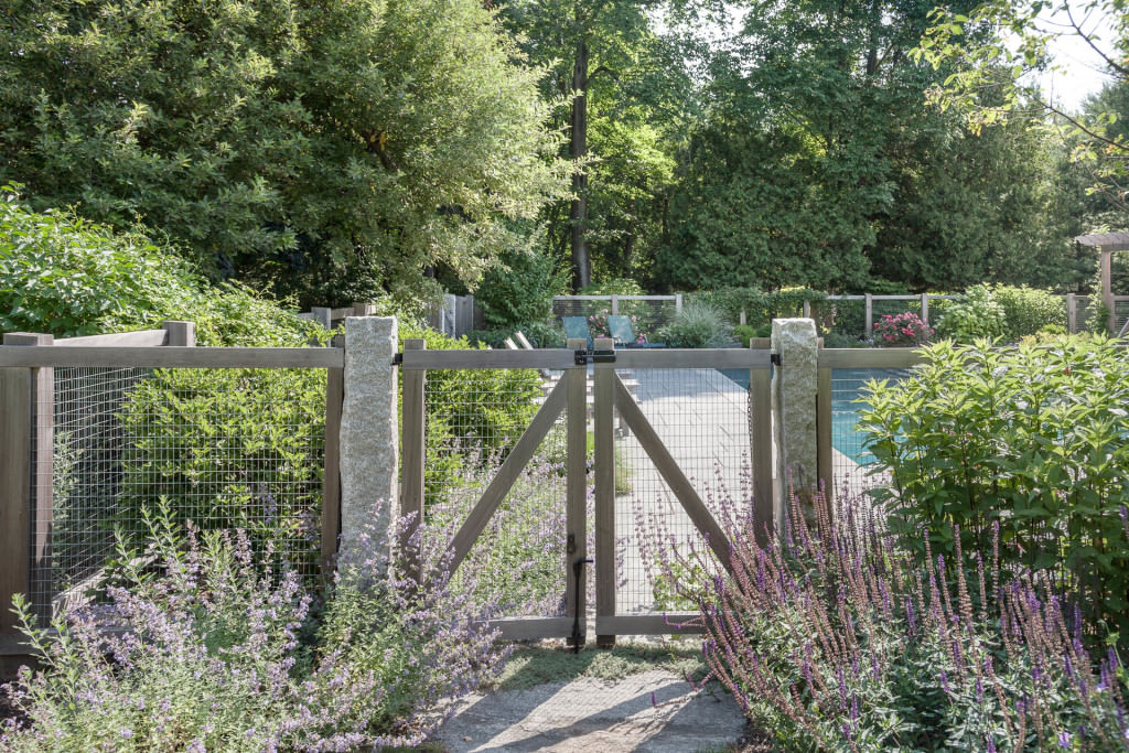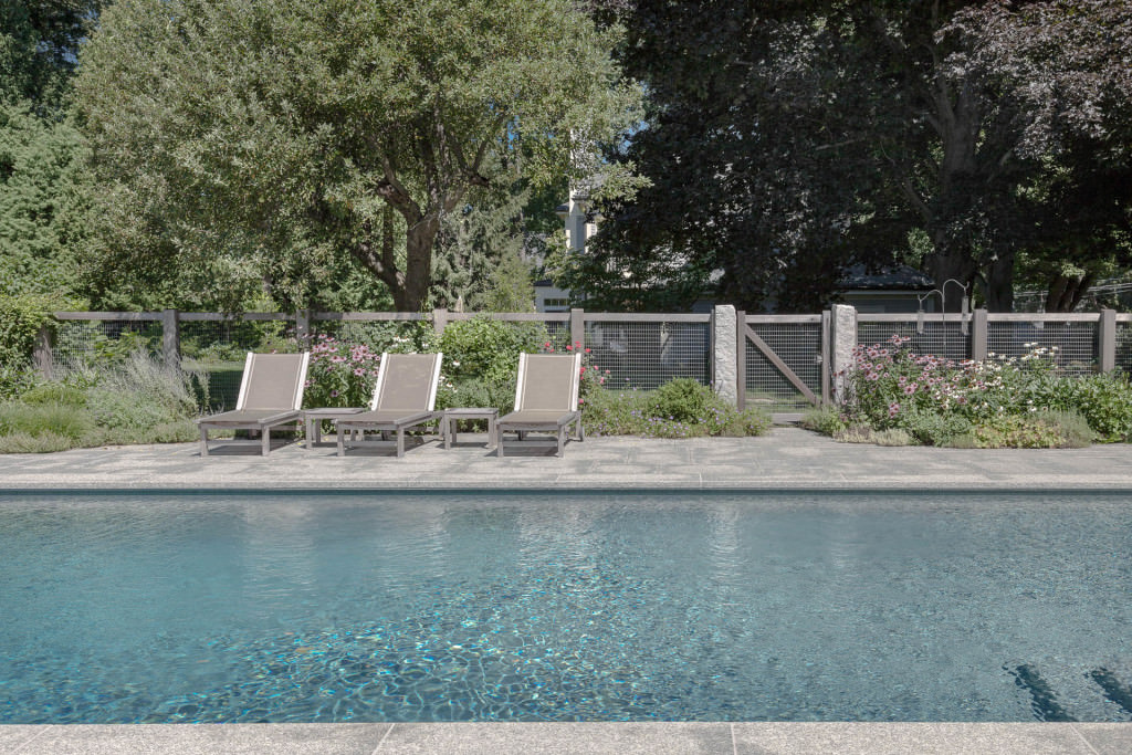 A new swimming pool garden surrounded by vibrant, deer-resistant perennial beds provides a soothing and tranquil oasis for a retired couple with children and grandchildren who visit regularly. A once dilapidated shed becomes a wonderful new destination amenity for this invigorating outdoor space. From outside the garden, large, weathered fieldstones dance amidst lawn and casually invite guests to the rustic setting. From inside the garden, thermal slabs of Abyss Green granite surround the pool in a random-ashlar pattern, and the hardscape is always comfortable to walk on, even on hot days. The new pool includes a continuous bench along one side, and an oversized staircase gives many areas for young kids to safely play. An elegant yet understated enclosure fence built from western red cedar, galvanized mesh, and granite accents, creates an almost invisible barrier that keeps the pool safe from wandering children and pets. A dining pergola provides additional shade, where a beautiful wisteria vine is quickly sculpting itself to the structure. Large new amelanchier trees anchor the garden to context and provide exceptional multi-seasonal displays.