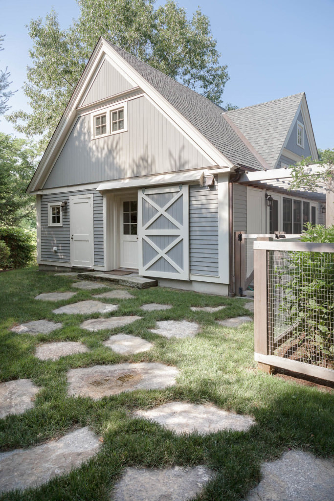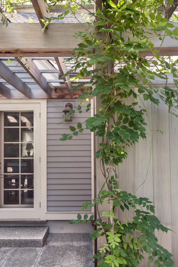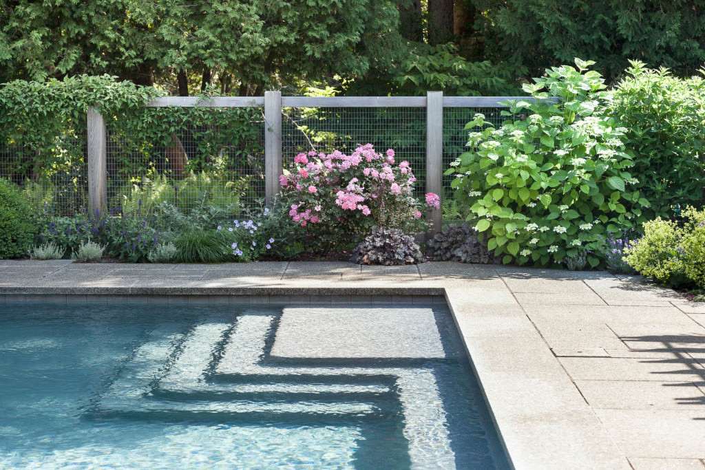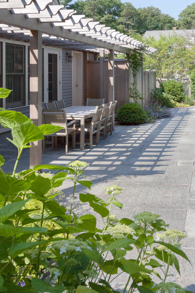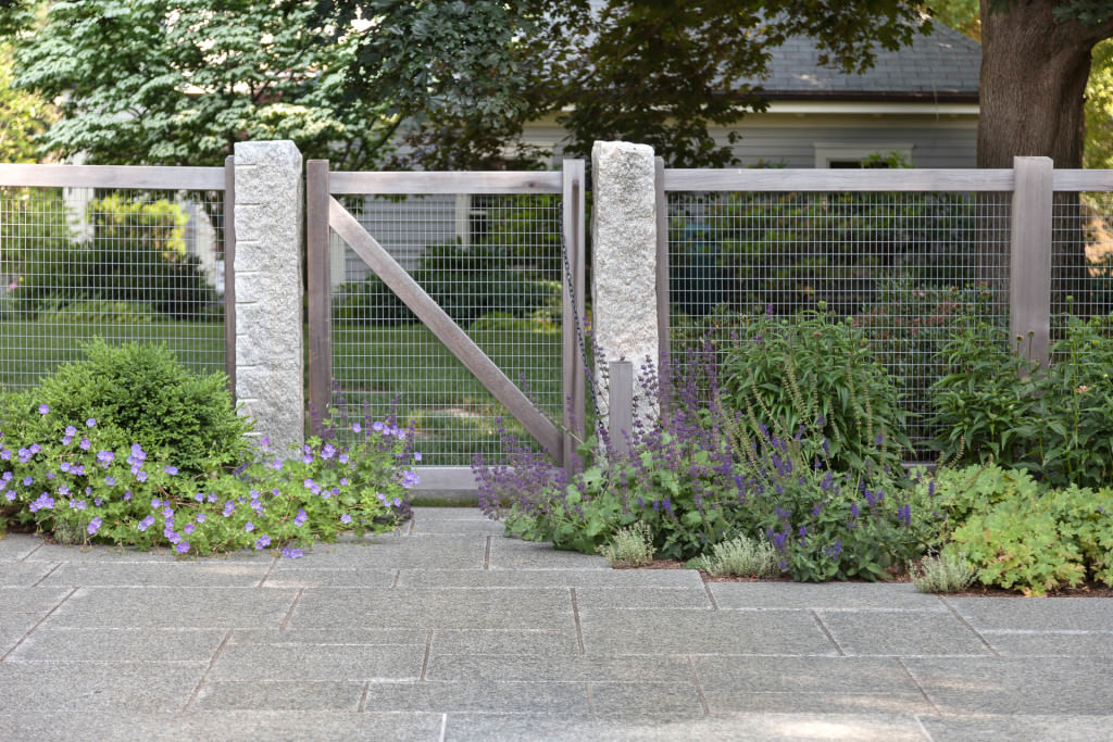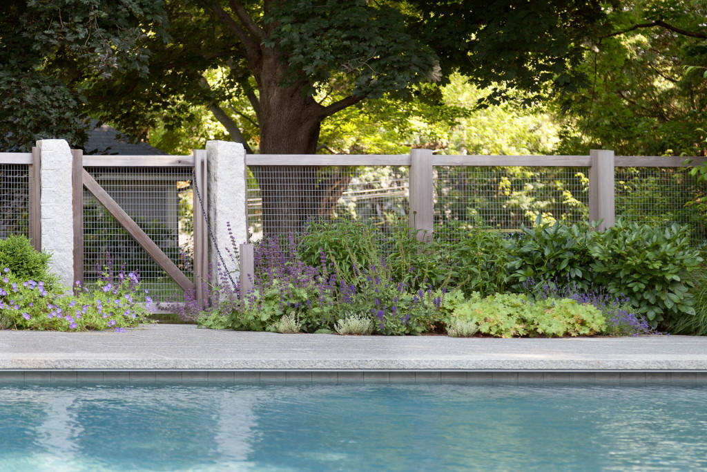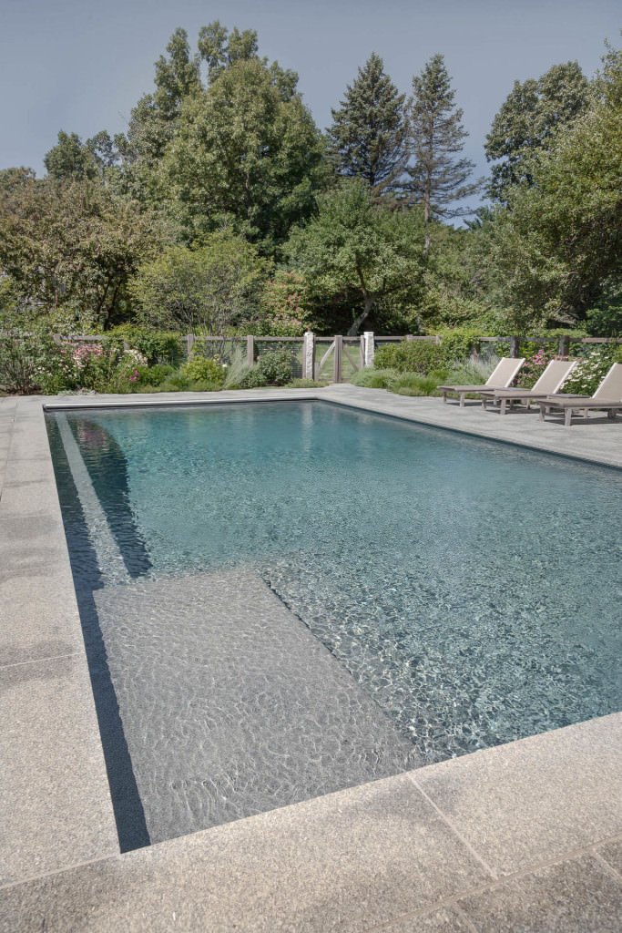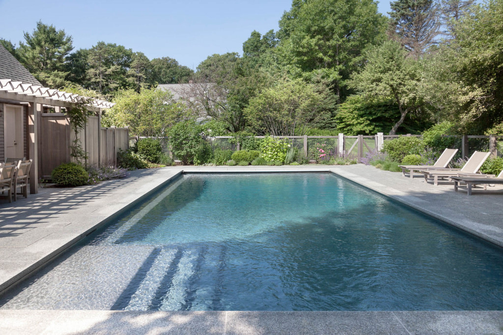 A new swimming pool garden surrounded by vibrant, deer-resistant perennial beds provides a soothing and tranquil oasis for a retired couple with children and grandchildren who visit regularly. A once dilapidated shed becomes a wonderful new destination amenity for this invigorating outdoor space. From outside the garden, large, weathered fieldstones dance amidst lawn and casually invite guests to the rustic setting. From inside the garden, thermal slabs of Abyss Green granite surround the pool in a random-ashlar pattern, and the hardscape is always comfortable to walk on, even on hot days. The new pool includes a continuous bench along one side, and an oversized staircase gives many areas for young kids to safely play. An elegant yet understated enclosure fence built from western red cedar, galvanized mesh, and granite accents, creates an almost invisible barrier that keeps the pool safe from wandering children and pets. A dining pergola provides additional shade, where a beautiful wisteria vine is quickly sculpting itself to the structure. Large new amelanchier trees anchor the garden to context and provide exceptional multi-seasonal displays.
