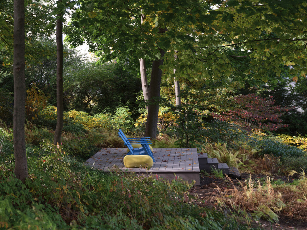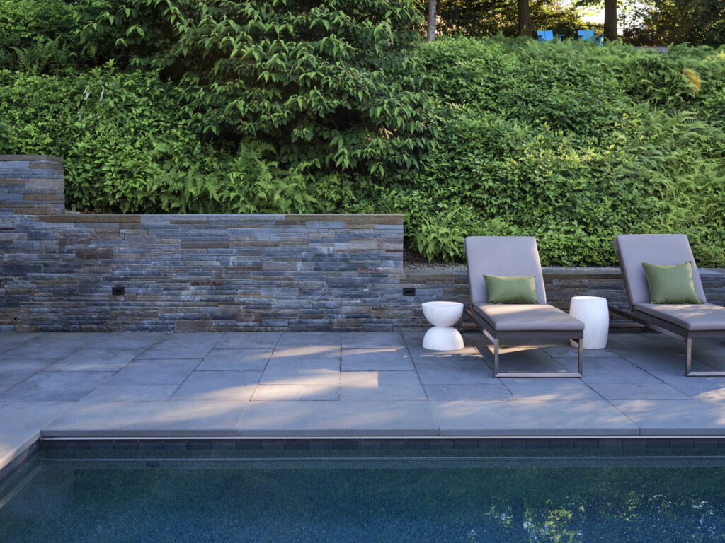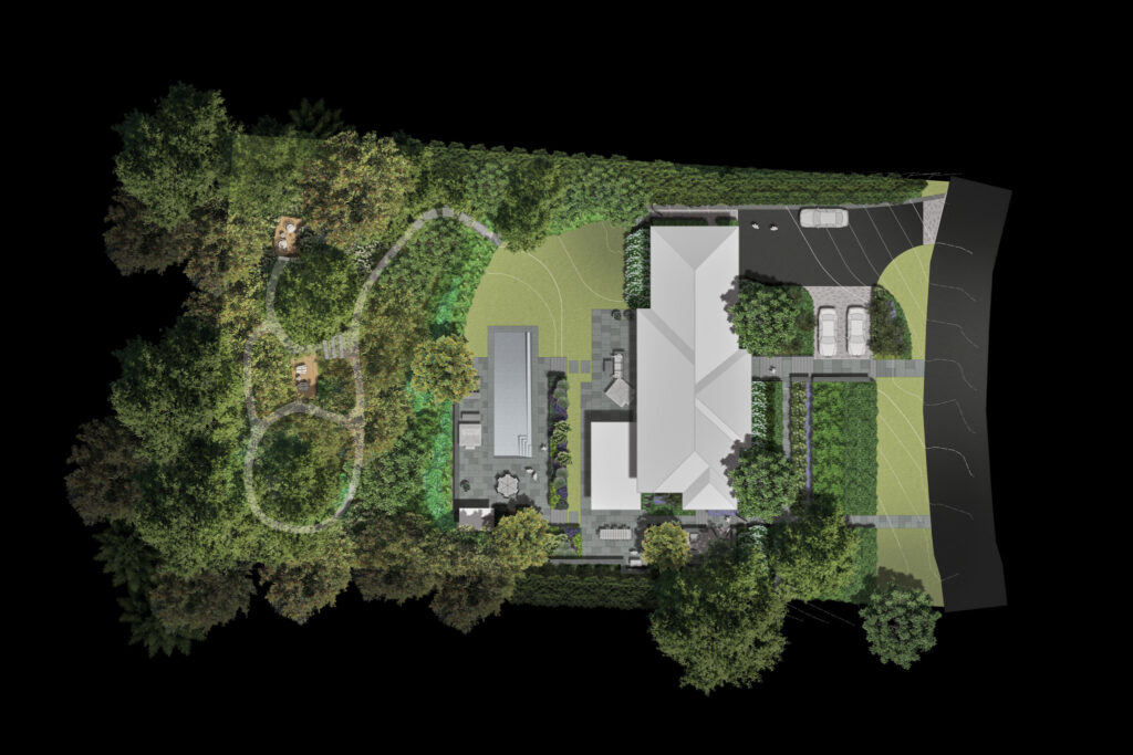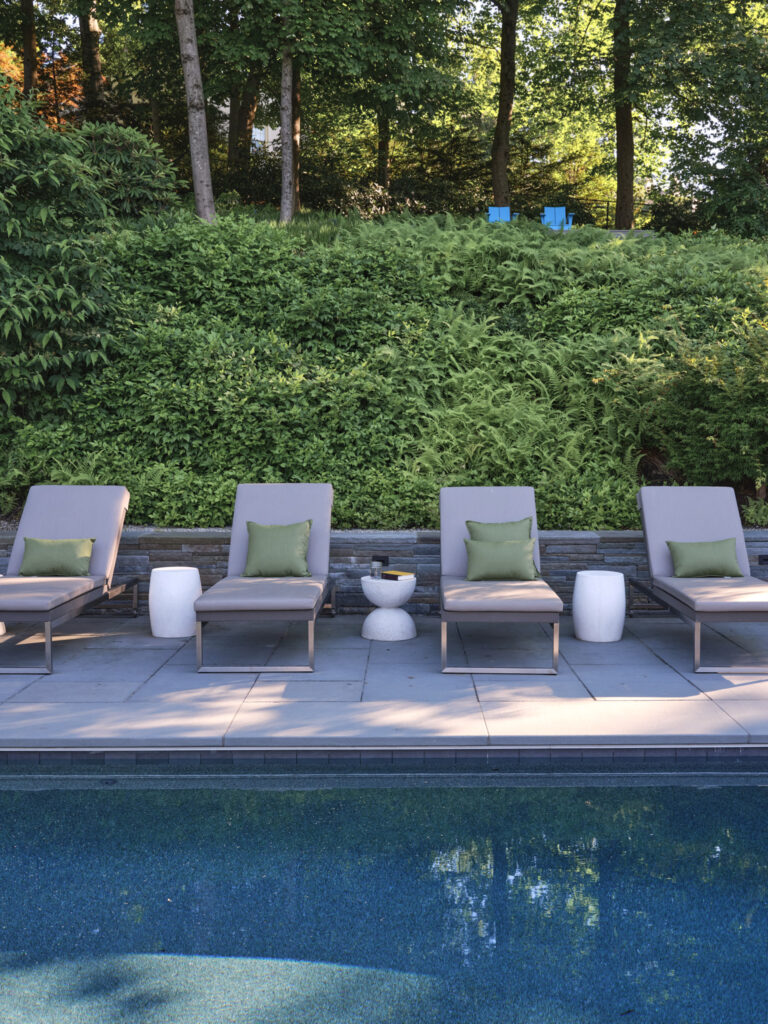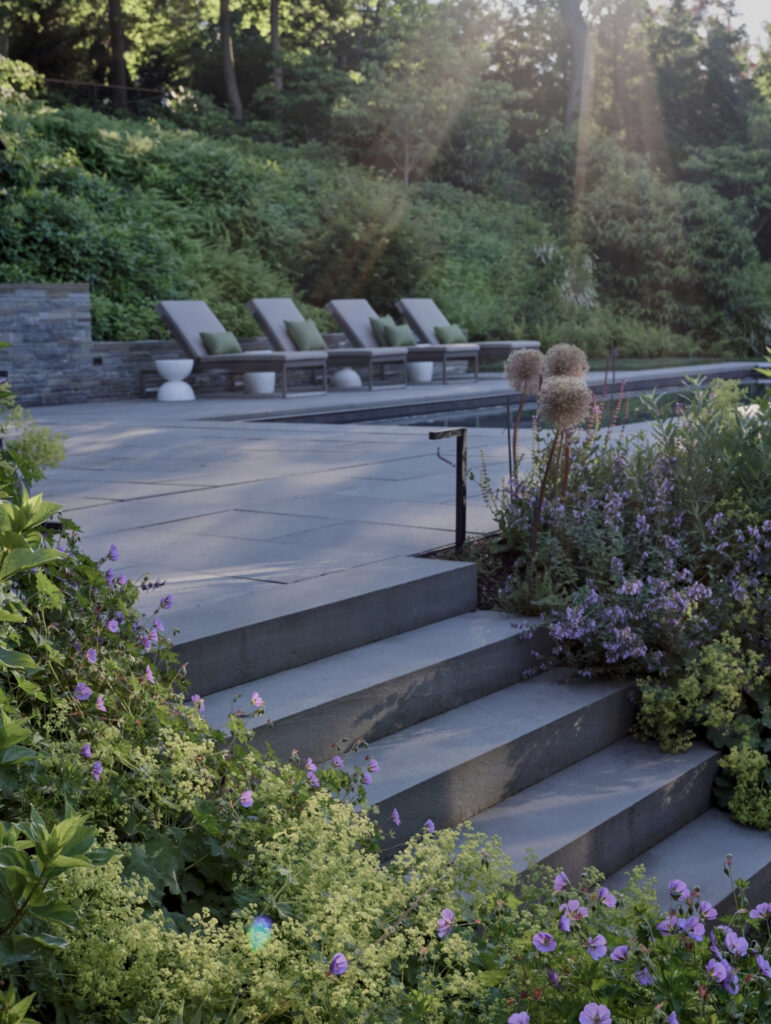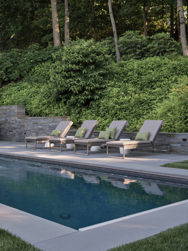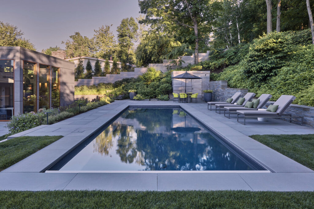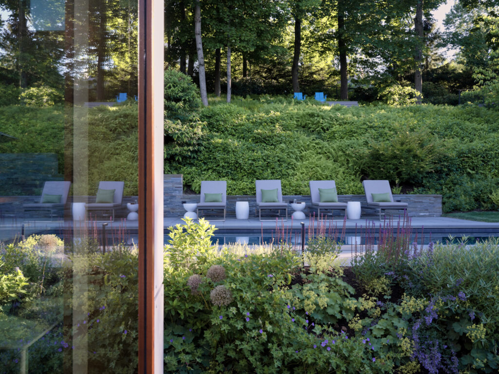 Nestled on a hillside in Chestnut Hill, Massachusetts an unassuming midcentury ranch was in desperate need of renovations, inside and out. The steeply sloping site was engulfed in invasive Japanese knotweed and Norway maples, and frequently inundated with stormwater runoff from uphill parcels. The visionary clients saw inherent possibilities in the property, looking to transform an unruly tangle of invasives into a suburban oasis. The clients had very simple program requests: a pool, sitting areas, and a means of exploring and experiencing the dramatic views from the highest points of the property. Three overarching goals guided the design process: utilizing the site’s unique topography to define gathering spaces, thoughtfully integrating stormwater management, and enhancing seasonal interest while restoring habitat value with native species.