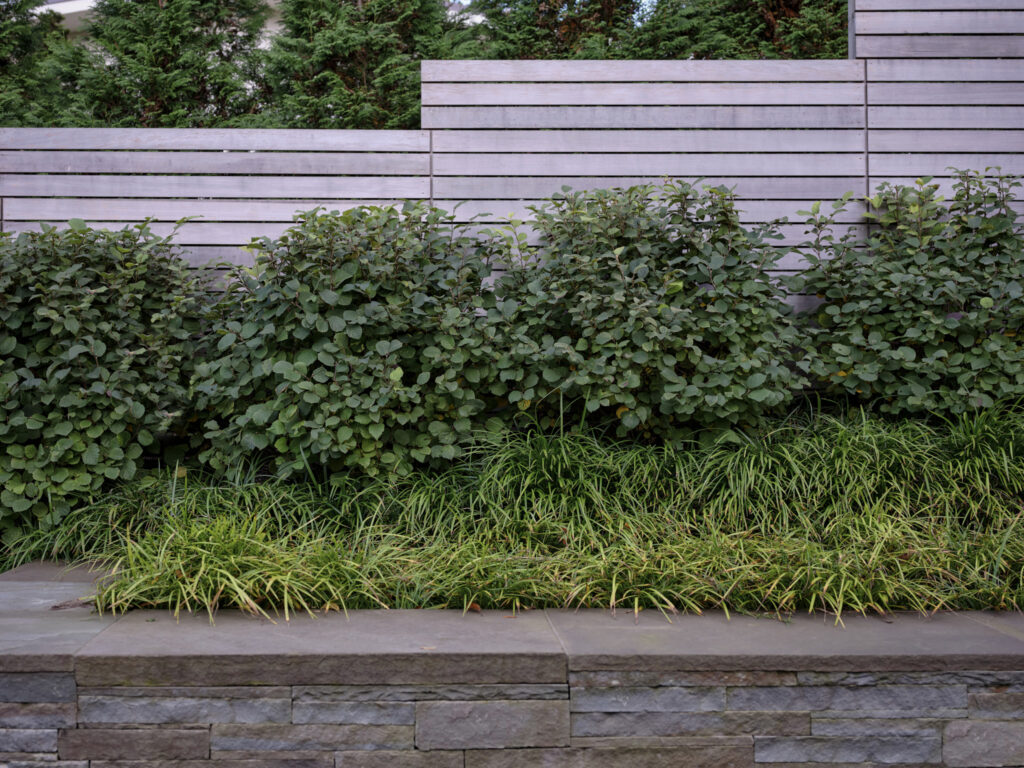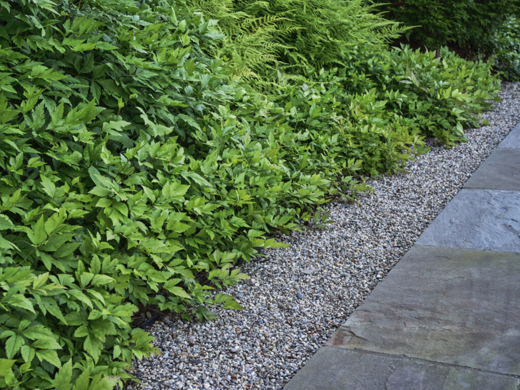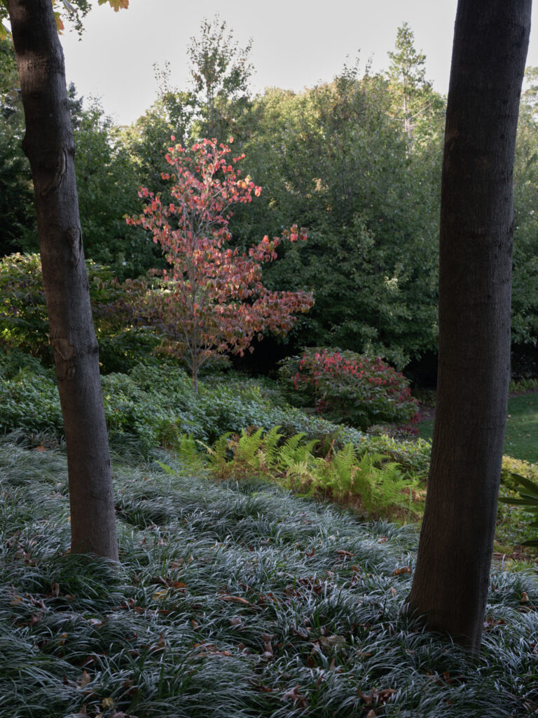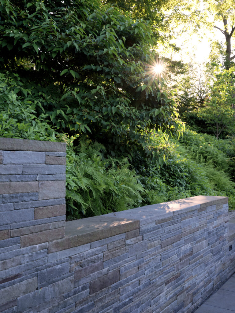 Selective thinning of the Norway maple trees, allowed the introduction of drifting understory colonies of native shrubs. Situated halfway up a hillside neighborhood, the property is constantly inundated by stormwater runoff from developed parcels further uphill; this runoff flows directly downhill into the reservoir. Stormwater management therefore became a key contributor to the sustainability of the garden. With more than forty feet of grade changes from front to back, a stone retaining wall cuts a terrace into the rear slope. An interceptor trench behind the wall couples with a system of subtle vegetated swales to convey water into a new infiltration system. A 60% reduction in lawn area further reduces the risk of nutrient-laden runoff, and expanded planting beds help slow, capture, and infiltrate stormwater that had previously run offsite.