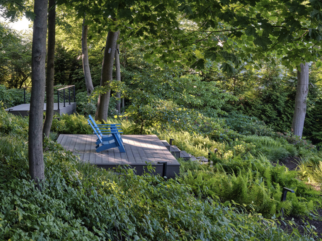 The once overgrown foundation plantings of the front yard are replaced by a welcoming entry sequence, softened by lush plantings. As the garden’s central feature, the pool was situated on an intermediate terrace several feet higher than the finish floor elevation of the house. Due to the slight grade change, the glassy new addition of the house looks out onto a sloped pollinator garden, forging an immediate connection between the garden and home’s interiors. Outdoor living and dining terraces surround the modern addition, complementing the interior floorplan. Rising beyond the pool, a hillside smothered with lush native shrubs and groundcovers climbs precipitously into the tree canopy, forming an ever-changing backdrop to the garden in all seasons. The hillside is now crisscrossed by a small network of paths leading to quiet destinations—a hammock and two small observation platforms. A climb up rambling stone steps and winding paths is rewarded with sweeping views across the reservoir and city skyline beyond. Where once a monoculture of knotweed offered little habitat value, a diverse tapestry of groundcovers has colonized the hillside, providing soil stabilization on the steep slopes.