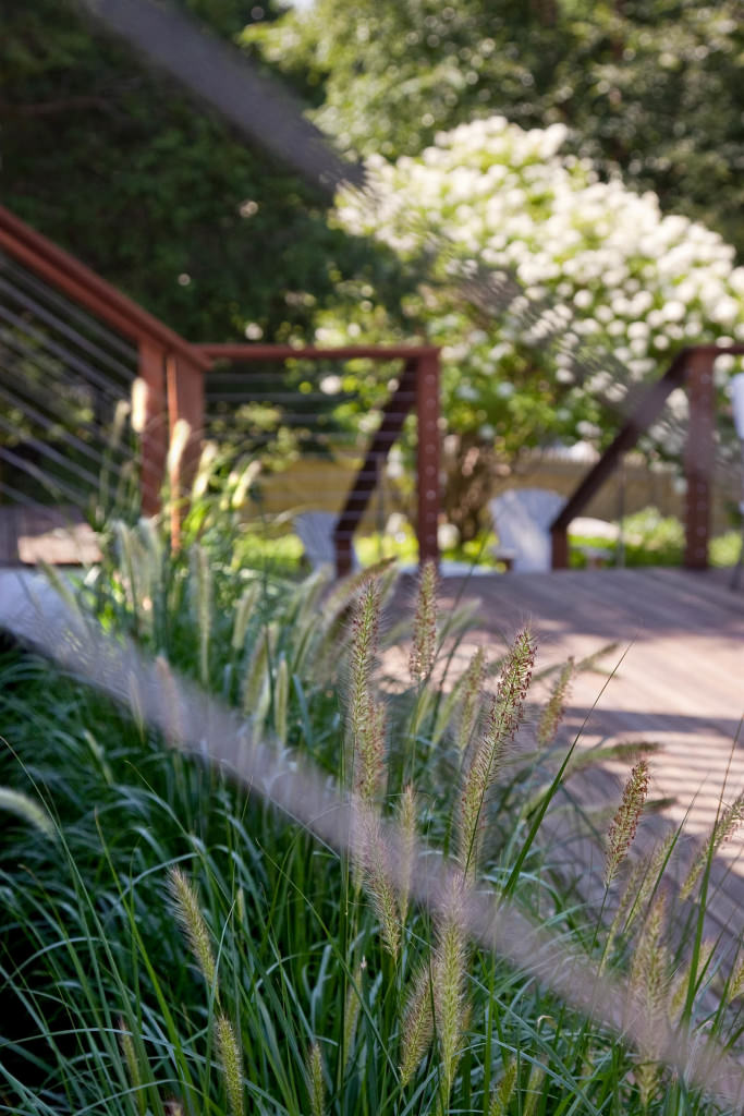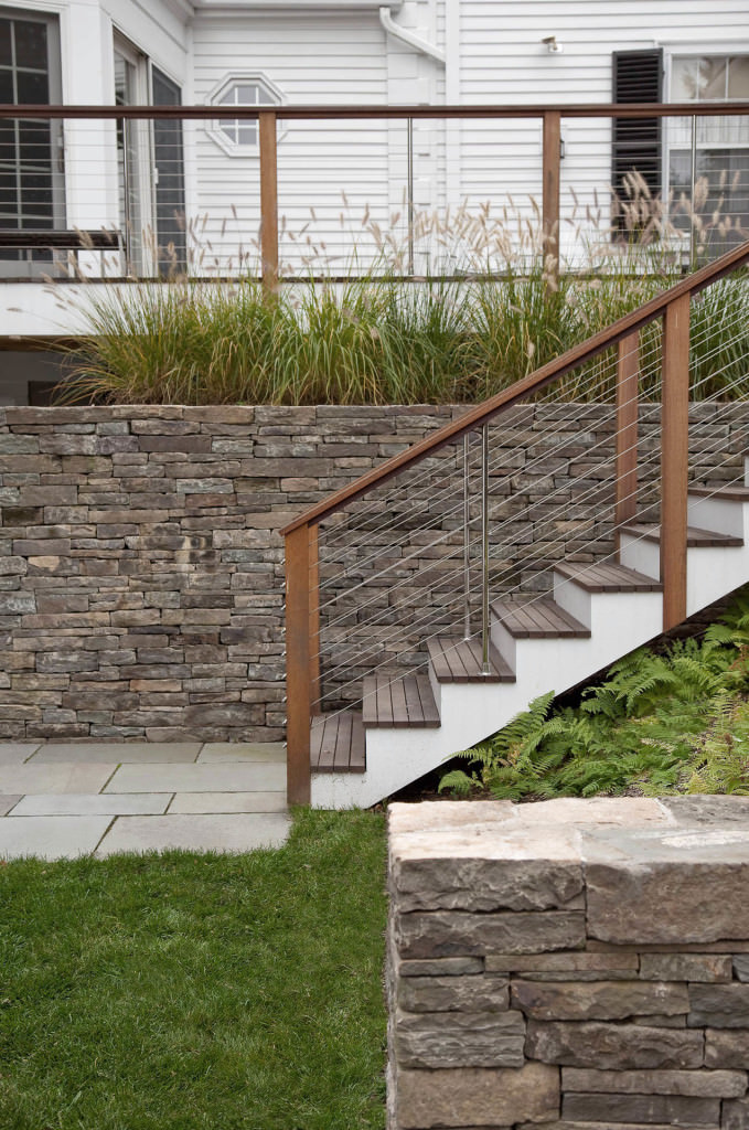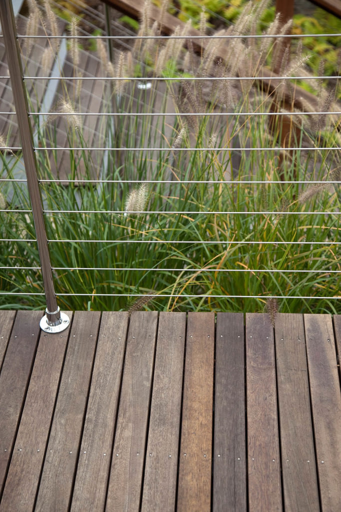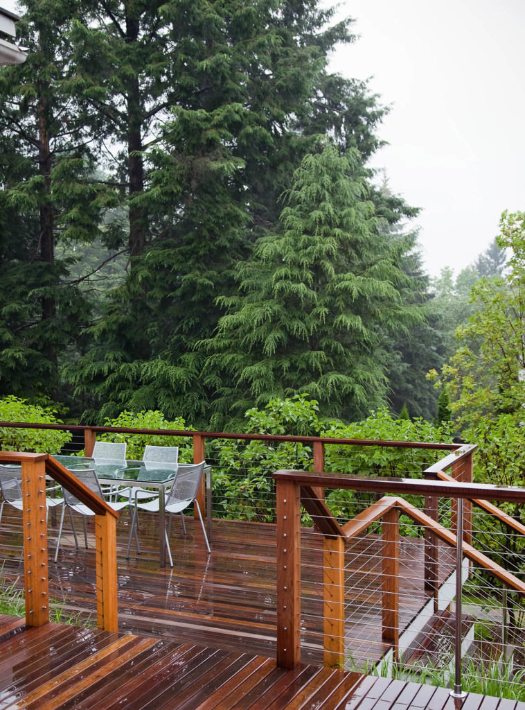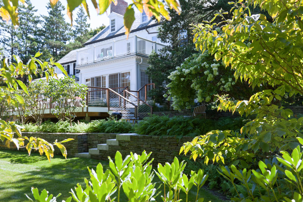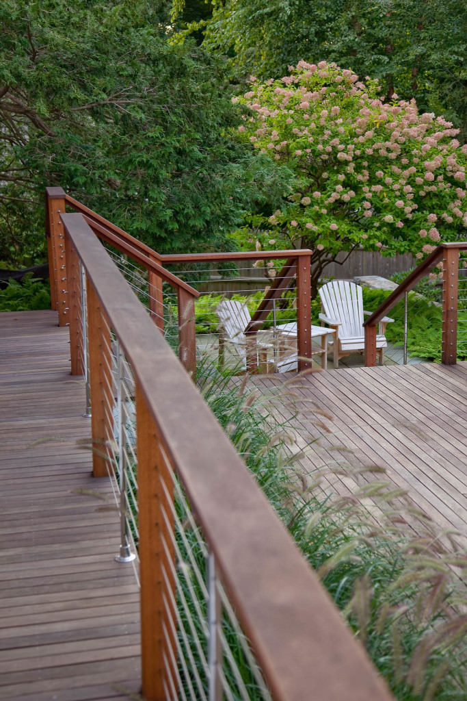Environmentally respectful outdoor spaces respond to topography, nestling purposefully into a northern slope. Retaining walls meticulously crafted from reclaimed stone rise from native groundcovers, and a granite staircase efficiently uses limited space. Tight deck systems constructed from FSC certified mahogany extend over walls, and stainless steel railings form interesting geometries. Crisp, unified landscape features complement elegant house details. Valuable canopy and specimen vegetation is preserved, setting an established tone for the garden. A transplanted tree hydrangea becomes a dazzling late summer focal point, and low-maintenance plantings conserve water. The landscape provides refined, durable spaces for an active modern family.