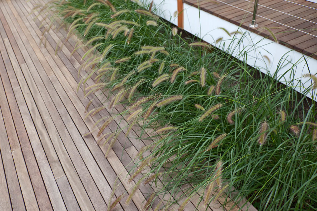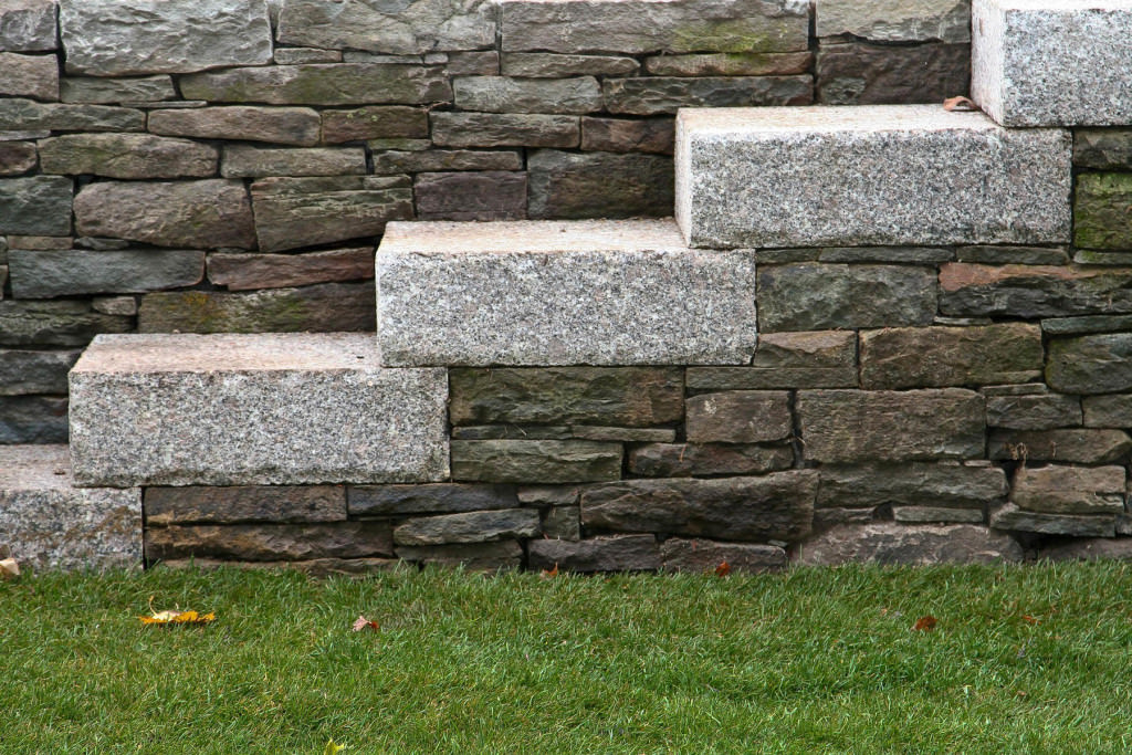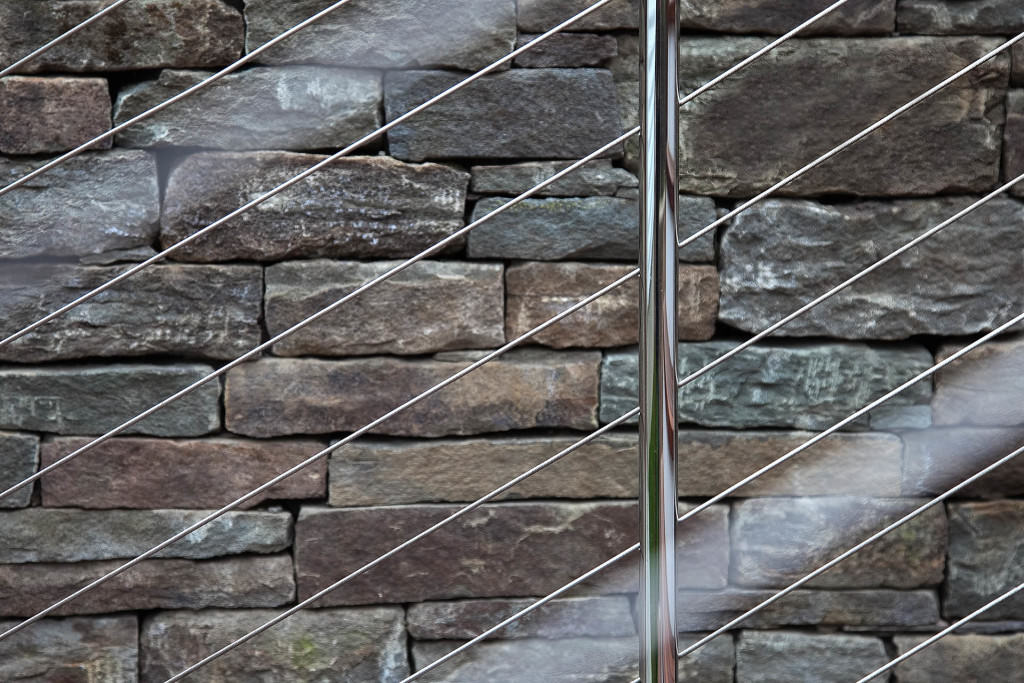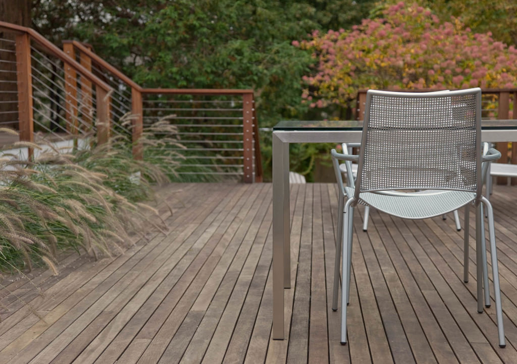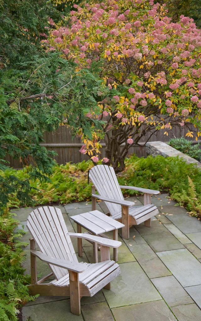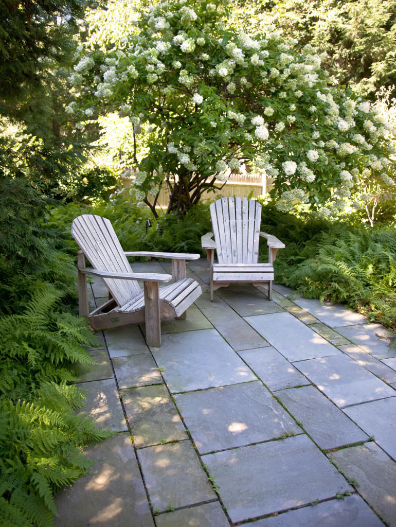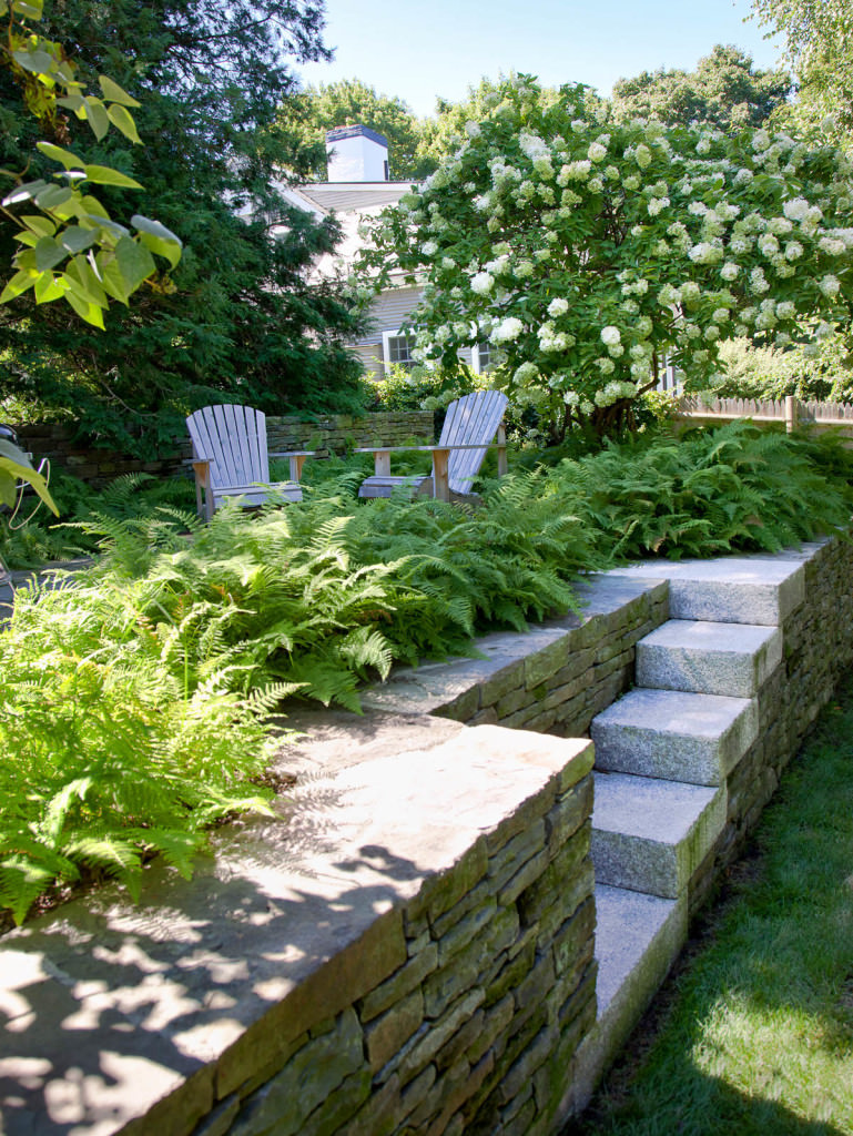 Environmentally respectful outdoor spaces respond to topography, nestling purposefully into a northern slope. Retaining walls meticulously crafted from reclaimed stone rise from native groundcovers, and a granite staircase efficiently uses limited space. Tight deck systems constructed from FSC certified mahogany extend over walls, and stainless steel railings form interesting geometries. Crisp, unified landscape features complement elegant house details. Valuable canopy and specimen vegetation is preserved, setting an established tone for the garden. A transplanted tree hydrangea becomes a dazzling late summer focal point, and low-maintenance plantings conserve water. The landscape provides refined, durable spaces for an active modern family.