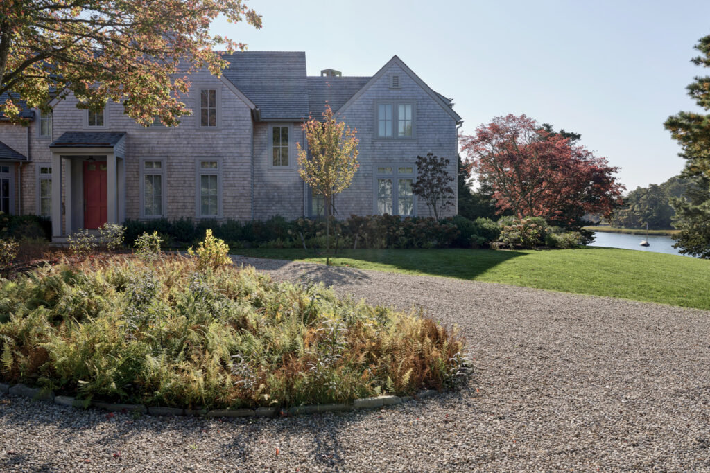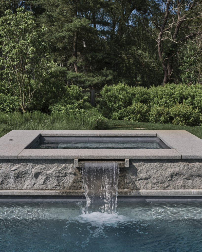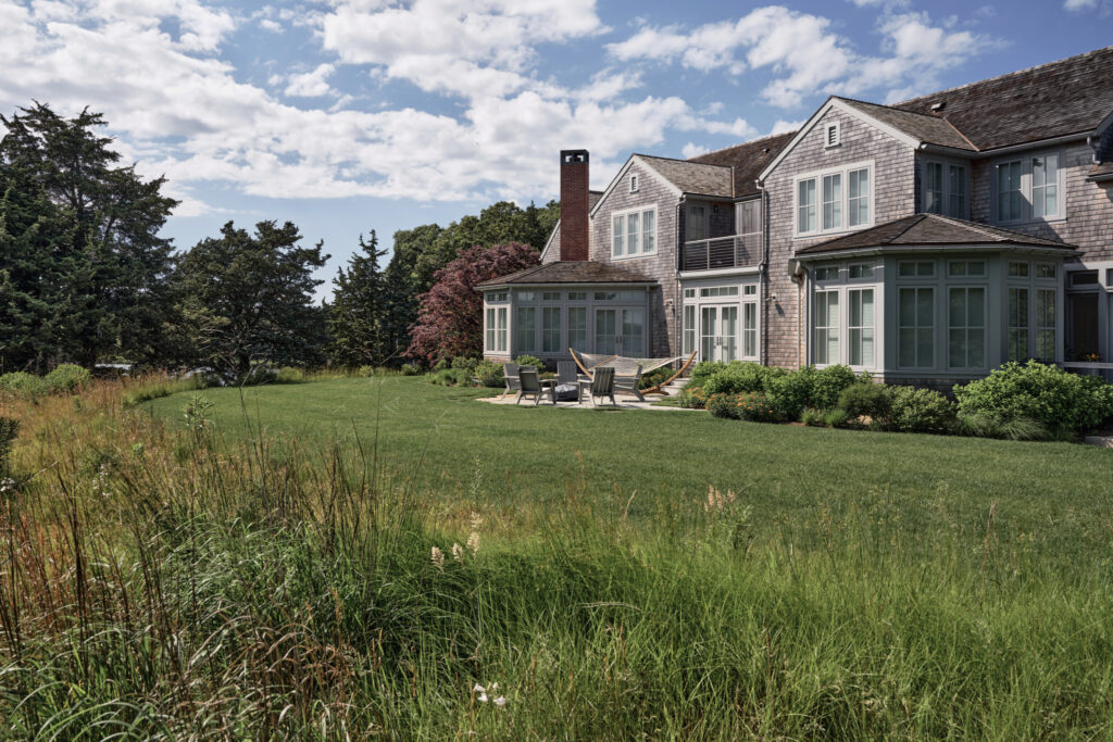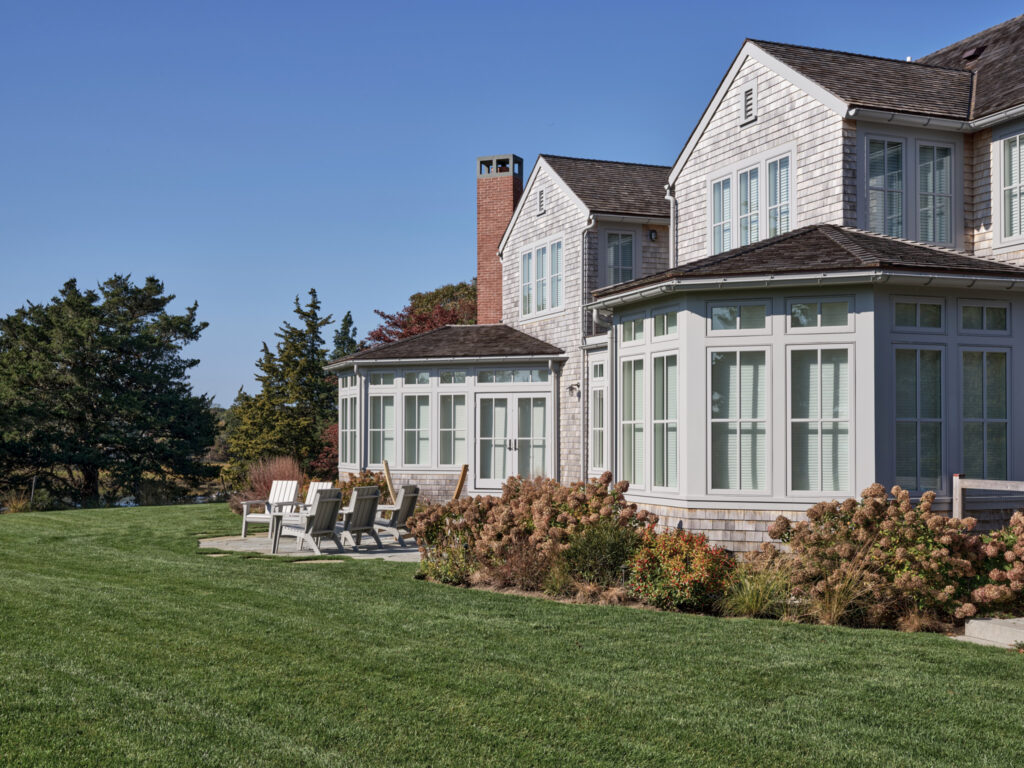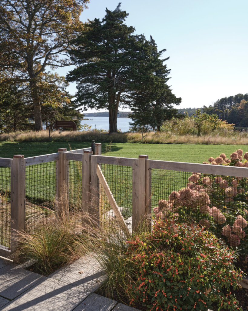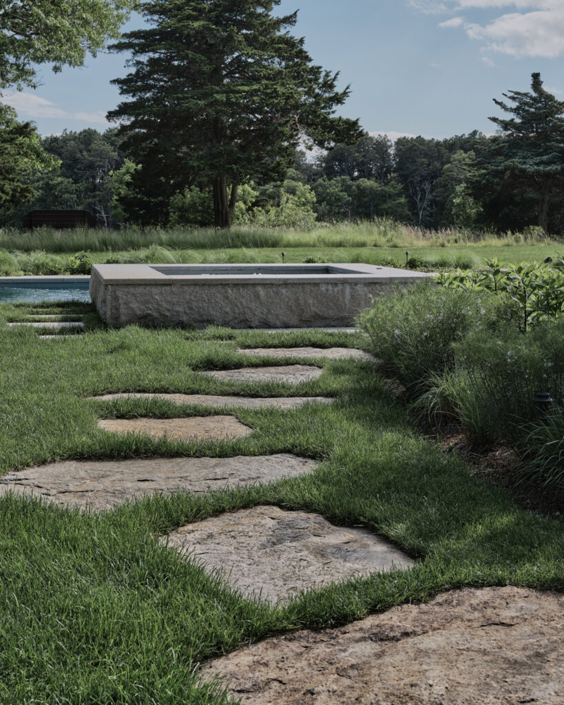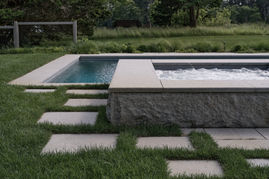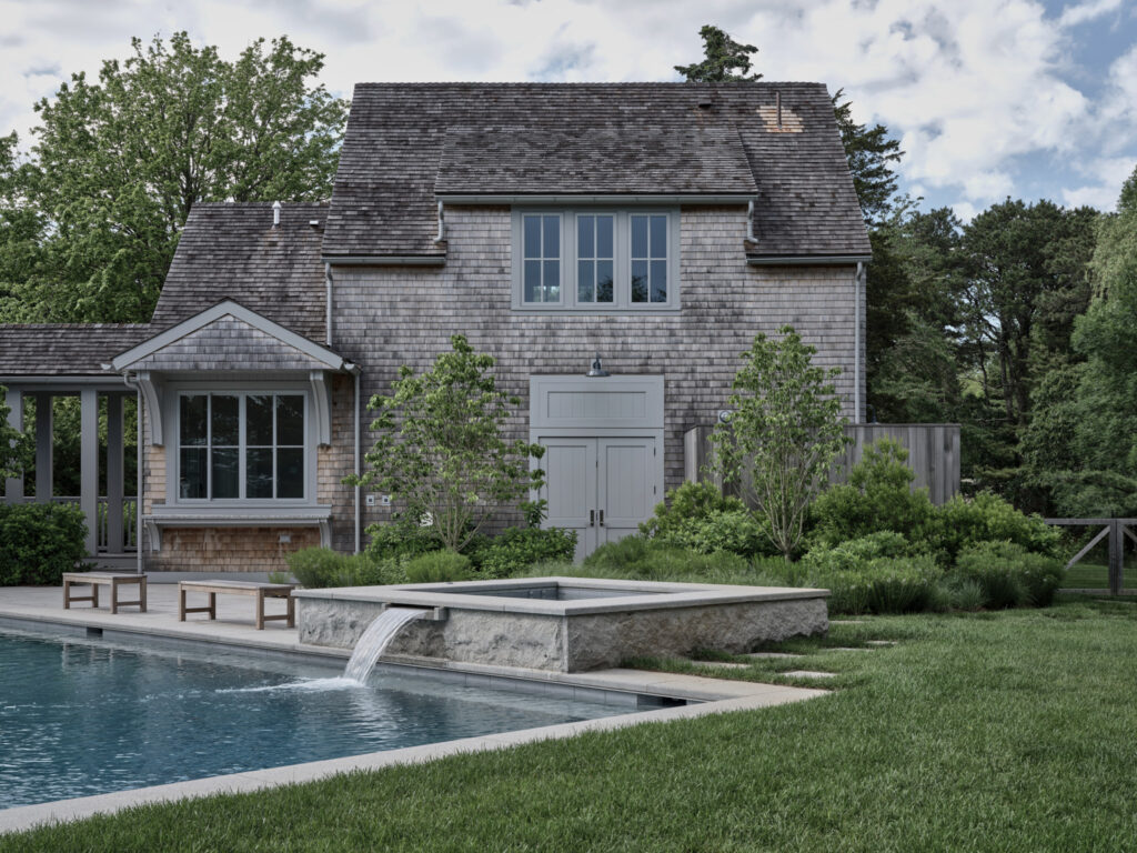 From the moment the new owners of this sprawling waterfront property on Frostfish Cove stepped foot here, they knew this was the place they had long been looking for. A winding gravel drive leads past a charming guest cottage, beneath the canopies of mature pines, and along the edges of managed meadow, ultimately leading to a modern shingle-style home at the top of a restored coastal bluff. The site, once occupied by a dilapidated vacation home, is punctuated with sculptural cedars and maples all the way down to the water’s edge. The trees attract migratory birds and provide wonderful scale to the structures. Paths built from irregularly shaped bluestone and fieldstone steppers lead to terraces that radiate from the prime living areas of the home. An elevated stone hot tub overflows into the pool, and a board-formed concrete retaining wall serves as pool enclosure, ensuring that views of the water remain unobstructed. Gracious swaths of native plants spill across the property, softening edges, nourishing wildlife, and stabilizing soils.