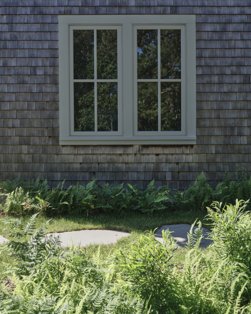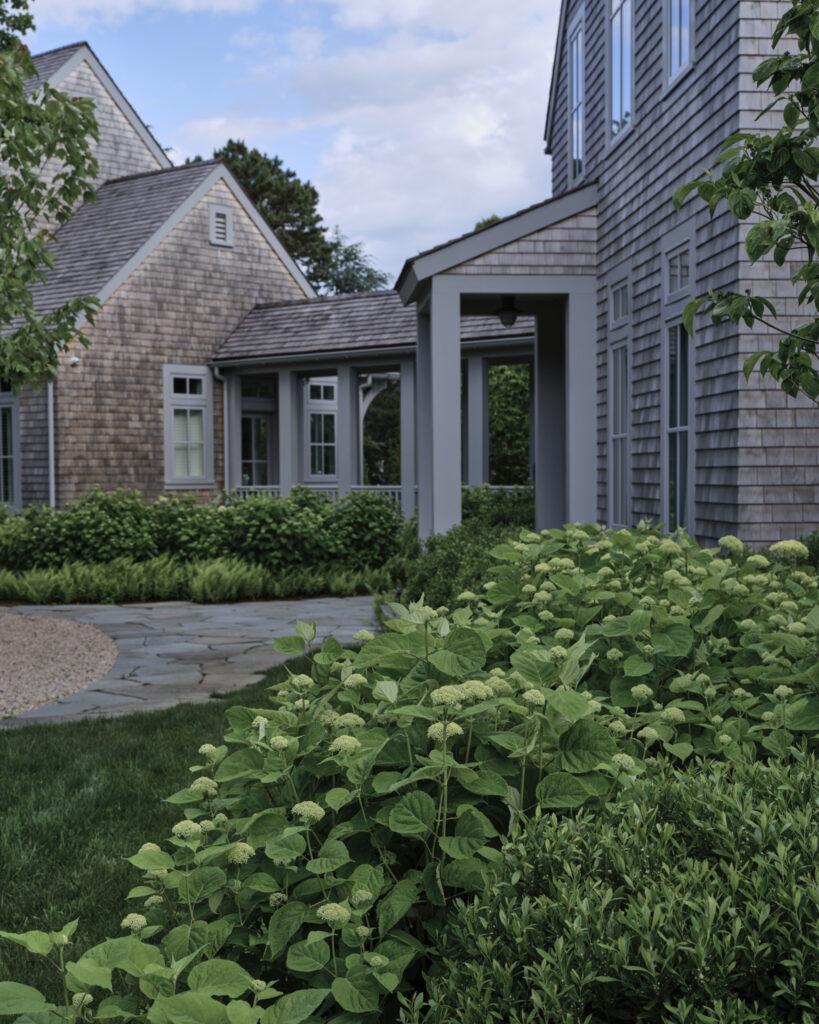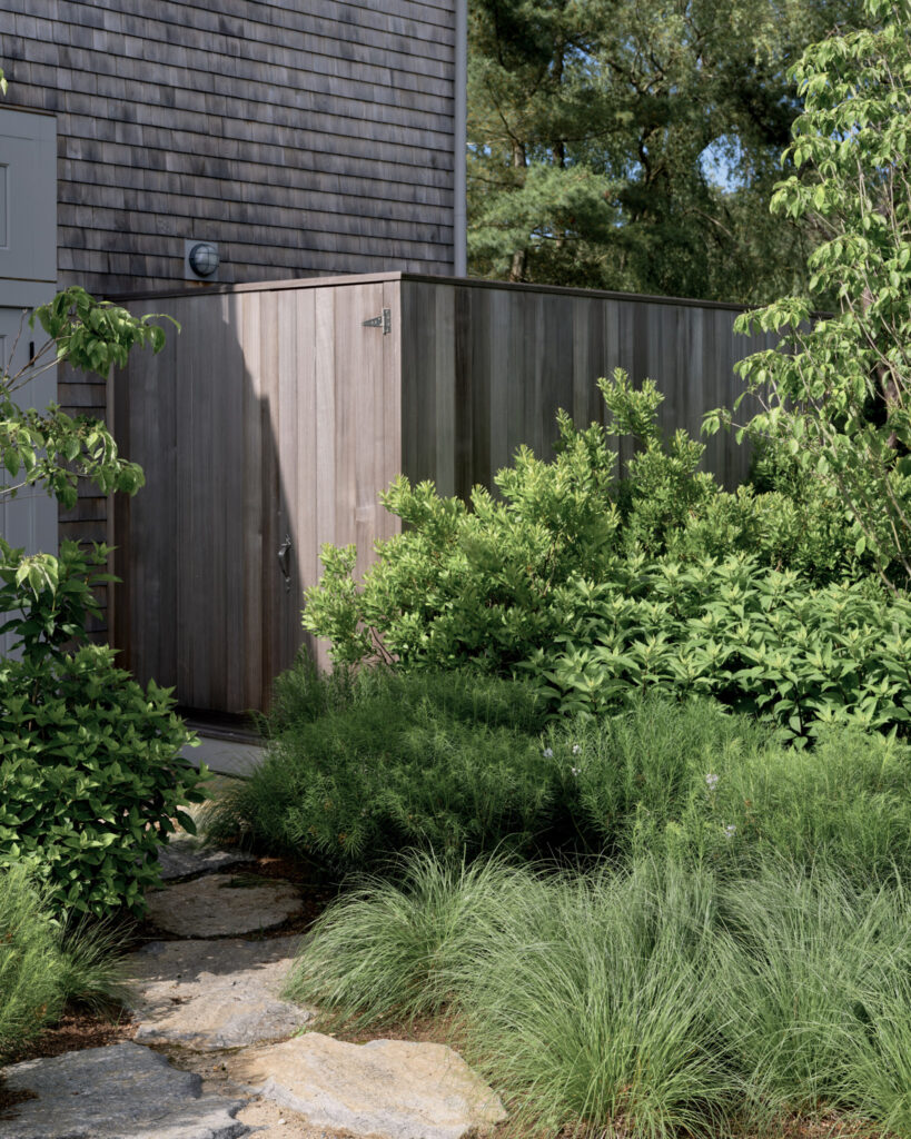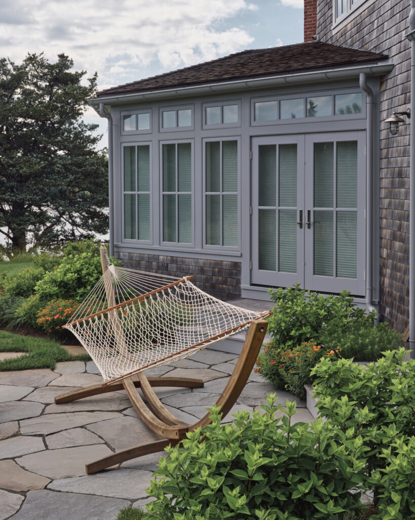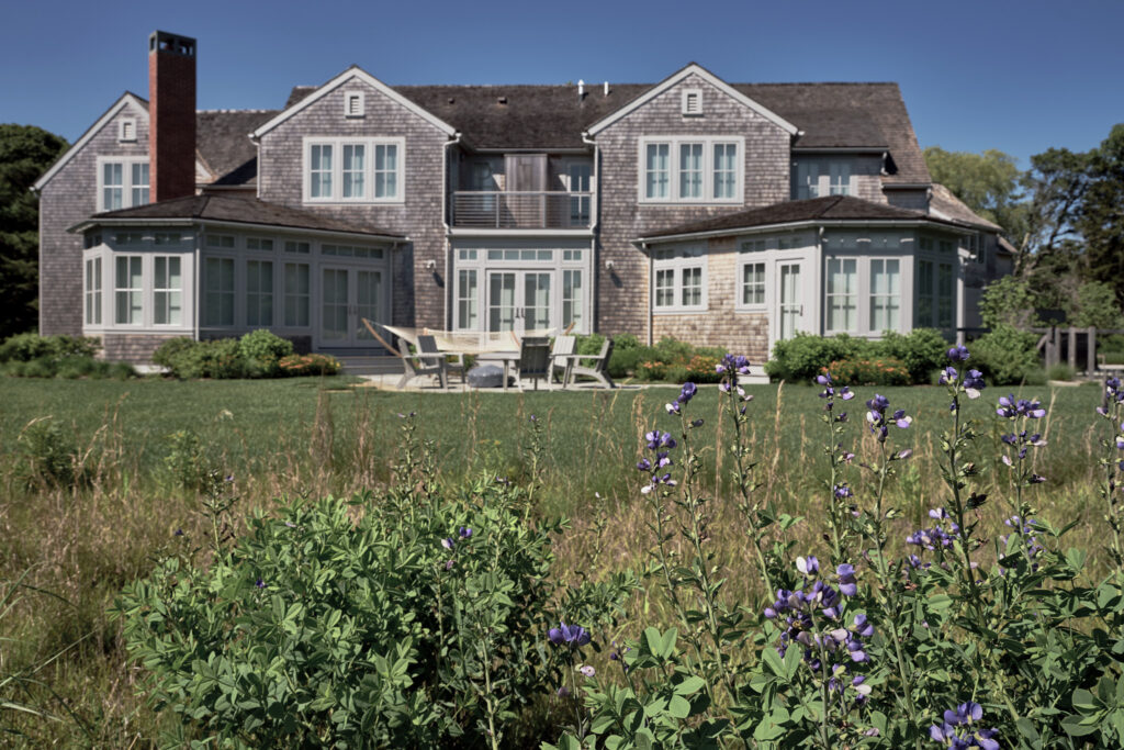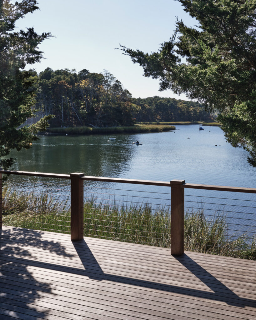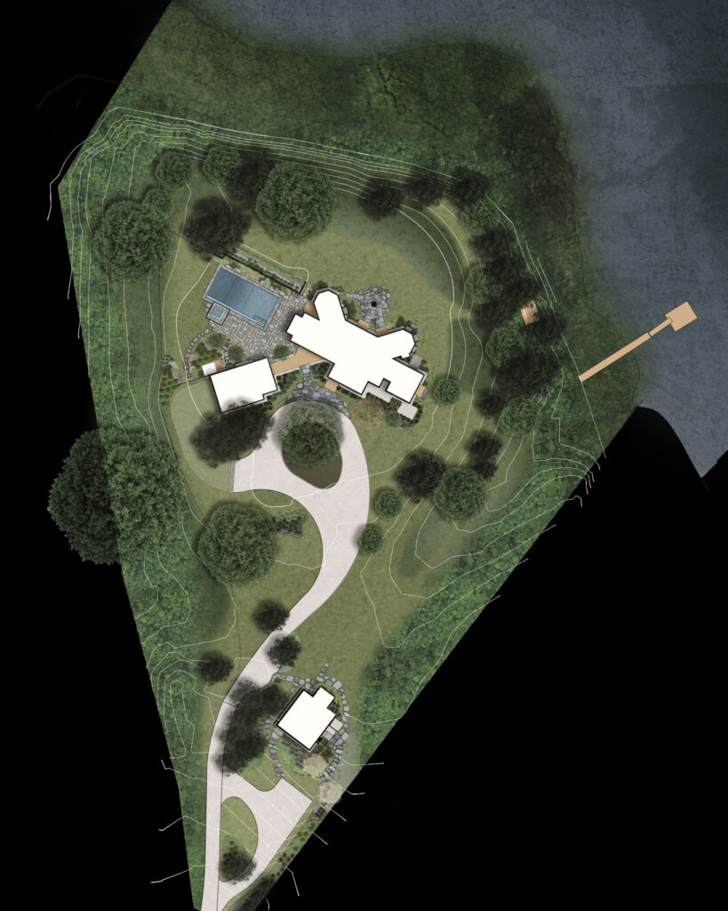 From the moment the new owners of this sprawling waterfront property on Frostfish Cove stepped foot here, they knew this was the place they had long been looking for. A winding gravel drive leads past a charming guest cottage, beneath the canopies of mature pines, and along the edges of managed meadow, ultimately leading to a modern shingle-style home at the top of a restored coastal bluff. The site, once occupied by a dilapidated vacation home, is punctuated with sculptural cedars and maples all the way down to the water’s edge. The trees attract migratory birds and provide wonderful scale to the structures. Paths built from irregularly shaped bluestone and fieldstone steppers lead to terraces that radiate from the prime living areas of the home. An elevated stone hot tub overflows into the pool, and a board-formed concrete retaining wall serves as pool enclosure, ensuring that views of the water remain unobstructed. Gracious swaths of native plants spill across the property, softening edges, nourishing wildlife, and stabilizing soils.
