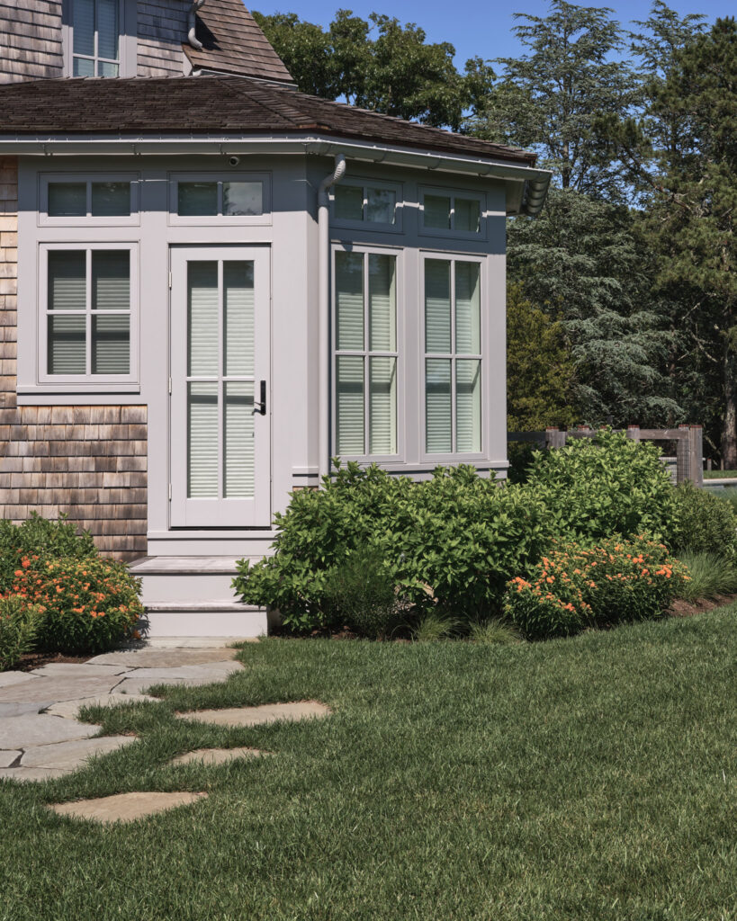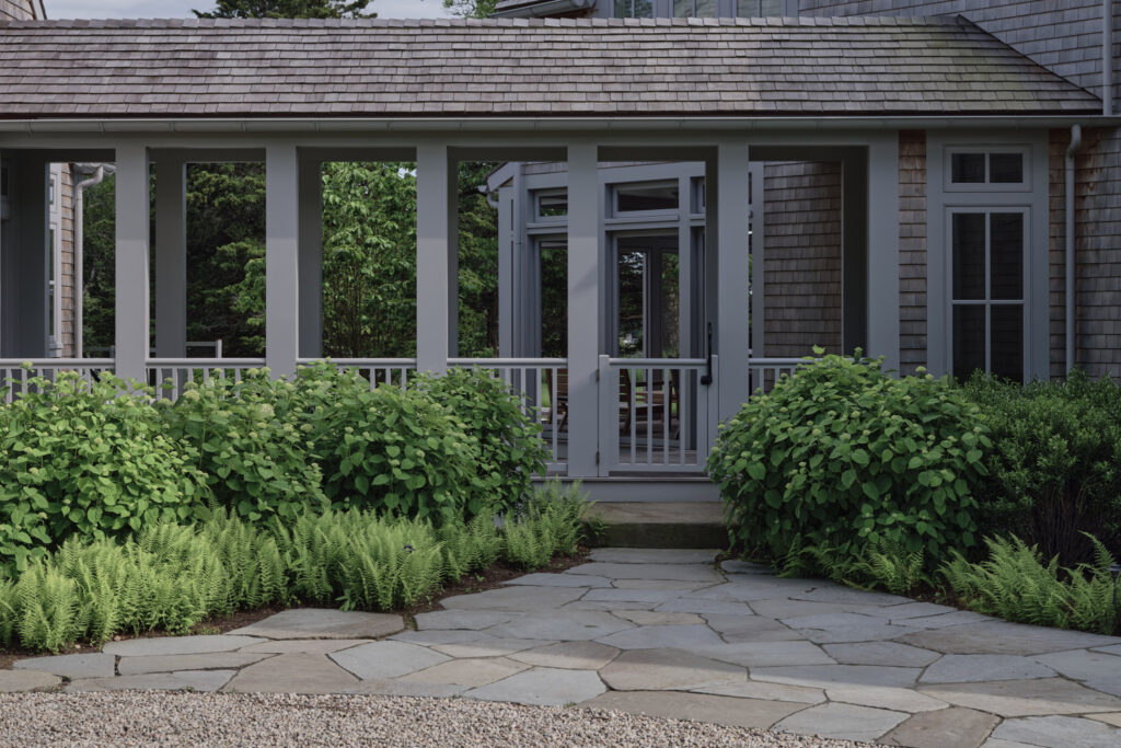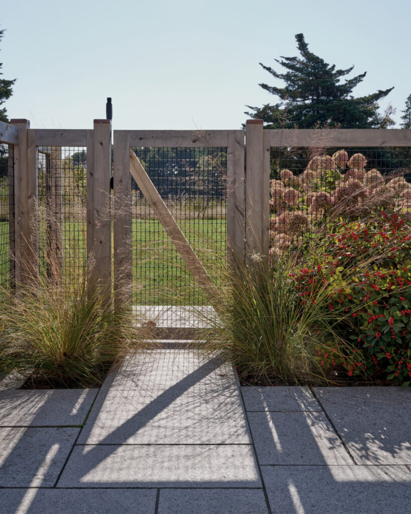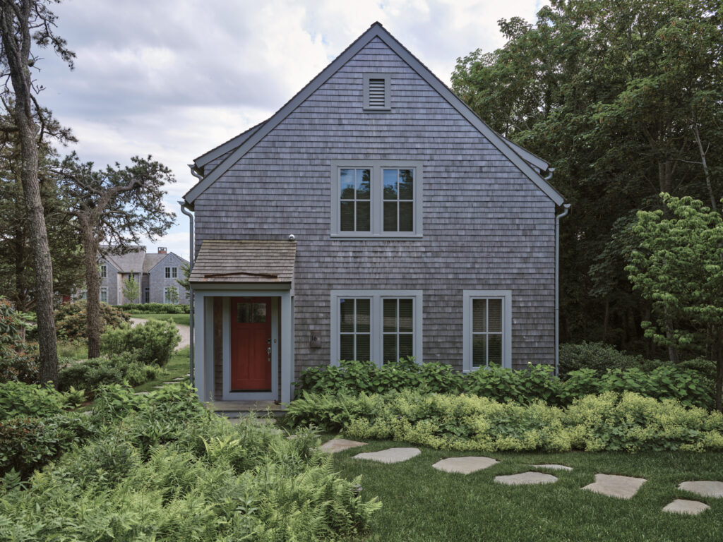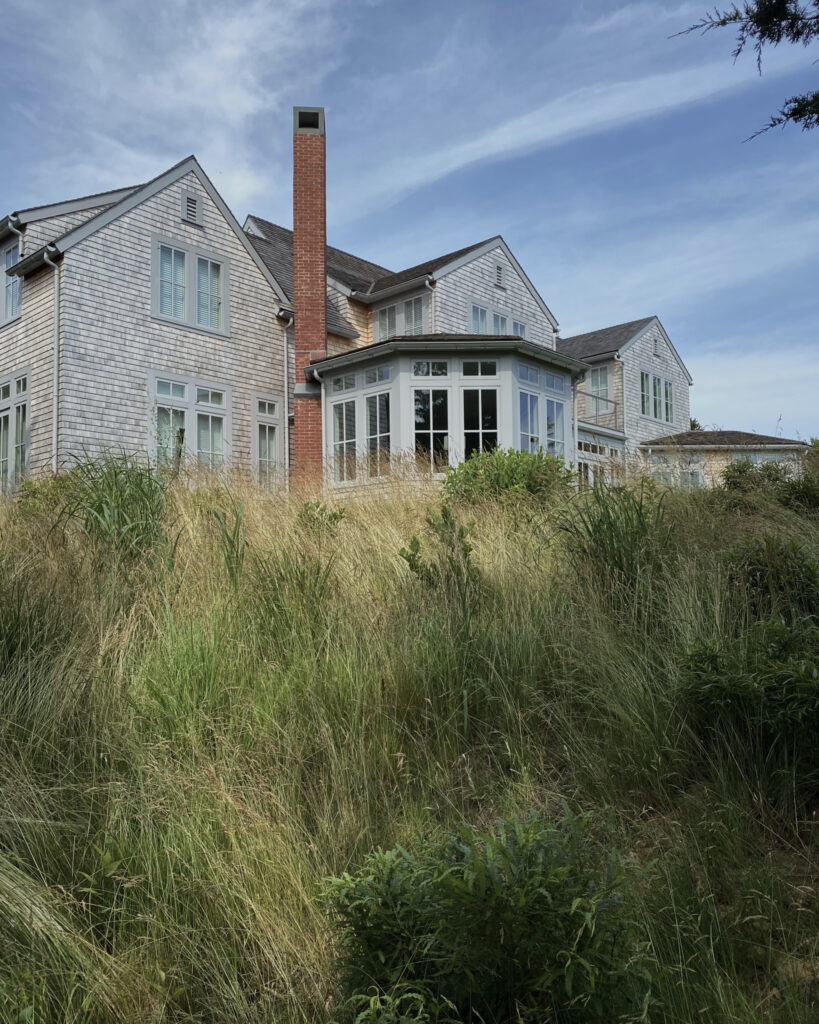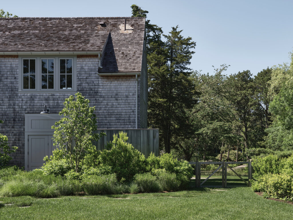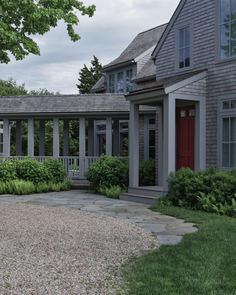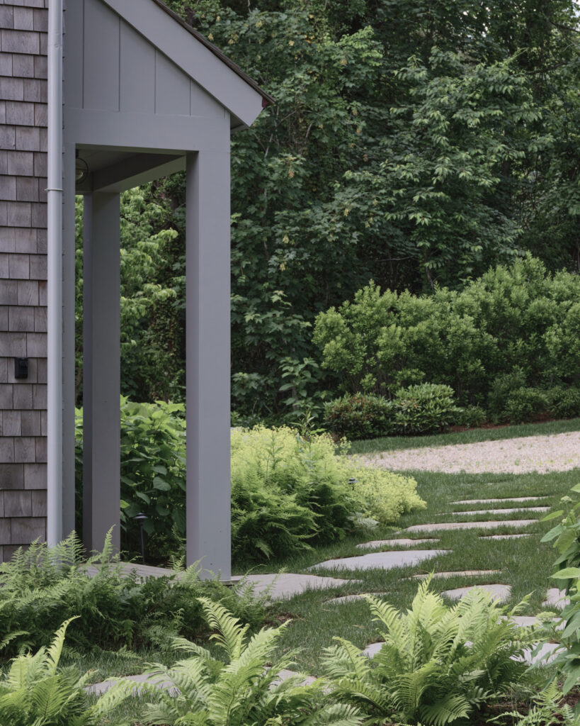 From the moment the new owners of this sprawling waterfront property on Frostfish Cove stepped foot here, they knew this was the place they had long been looking for. A winding gravel drive leads past a charming guest cottage, beneath the canopies of mature pines, and along the edges of managed meadow, ultimately leading to a modern shingle-style home at the top of a restored coastal bluff. The site, once occupied by a dilapidated vacation home, is punctuated with sculptural cedars and maples all the way down to the water’s edge. The trees attract migratory birds and provide wonderful scale to the structures. Paths built from irregularly shaped bluestone and fieldstone steppers lead to terraces that radiate from the prime living areas of the home. An elevated stone hot tub overflows into the pool, and a board-formed concrete retaining wall serves as pool enclosure, ensuring that views of the water remain unobstructed. Gracious swaths of native plants spill across the property, softening edges, nourishing wildlife, and stabilizing soils.