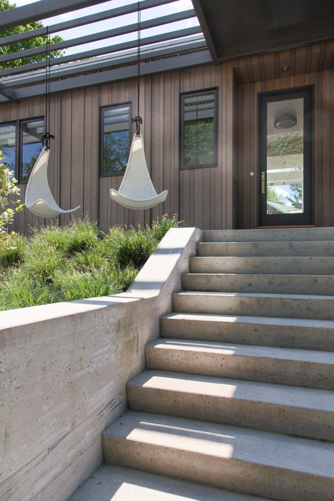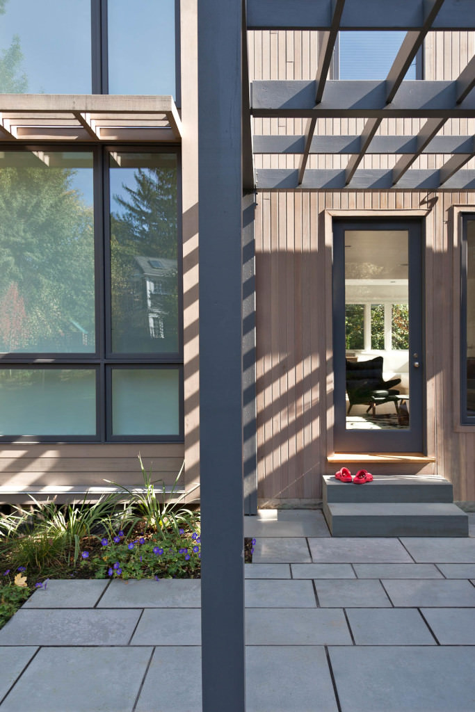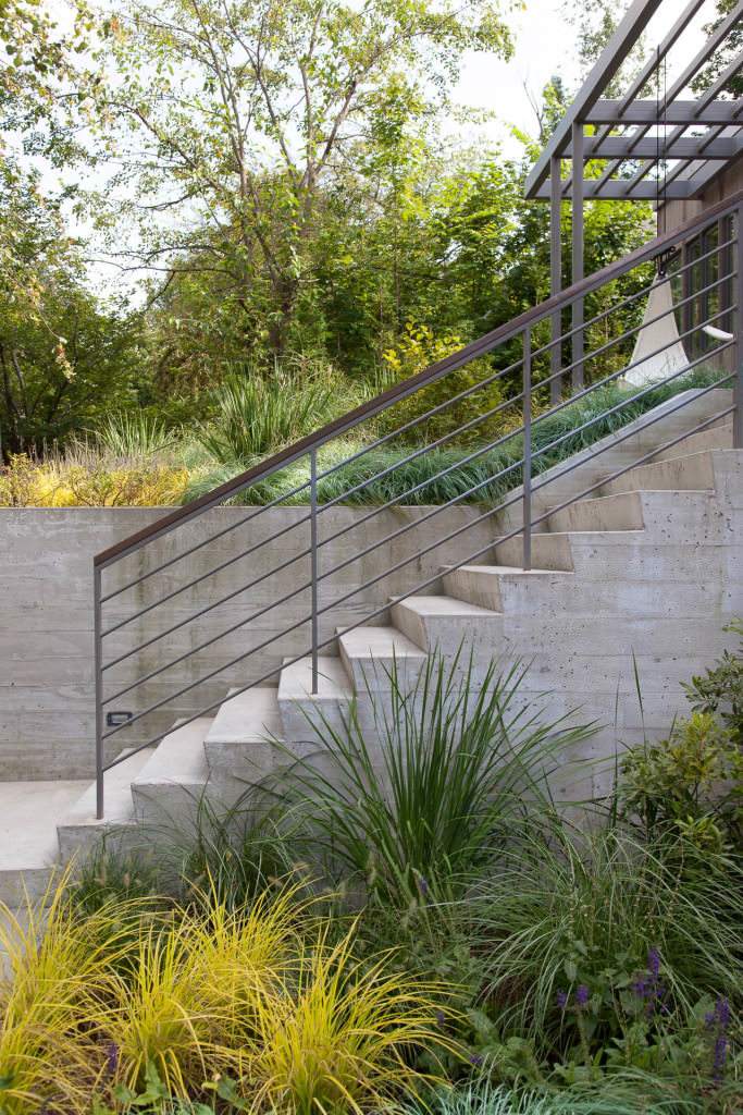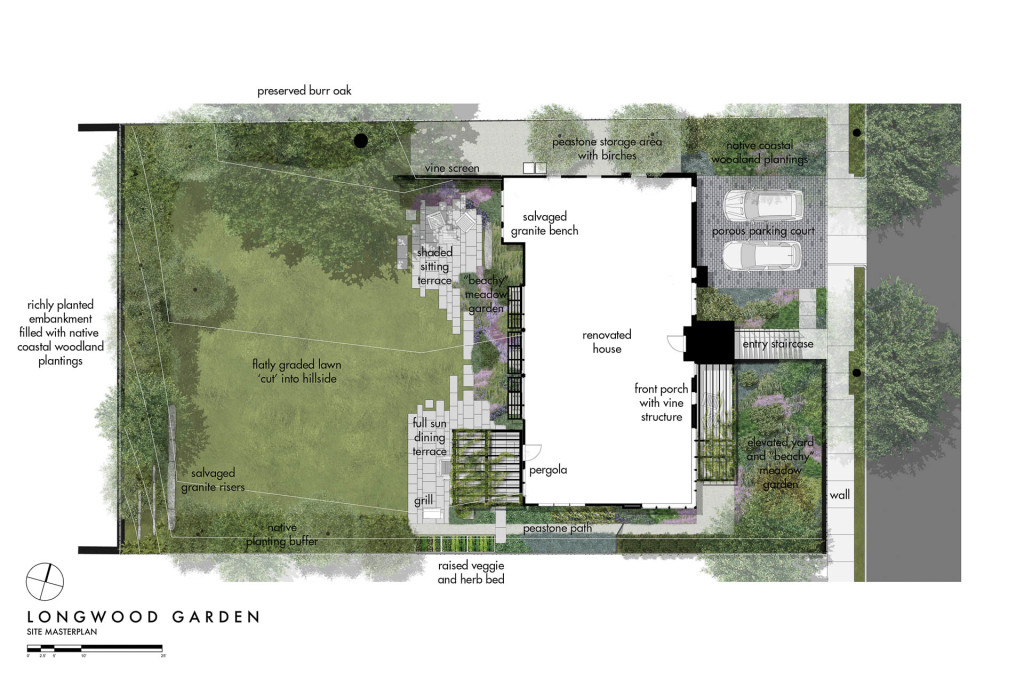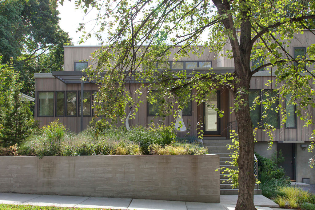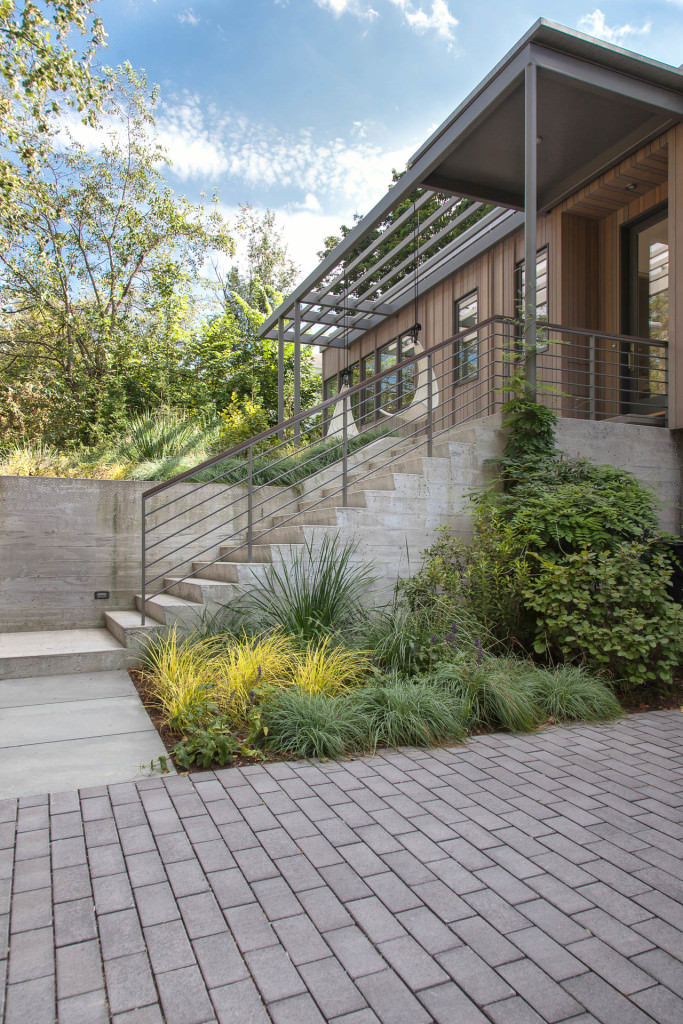 Beautifully textured board-form concrete retaining walls elevate the new front garden, with a fantastic porch and steel vine structure overlooking the busy streetscape. Boldly contrasting native plants provide foliage displays that soften hard edges with texture and movement. Terraces in the rear are positioned to enjoy both sun and shade. And multiple creative stormwater management strategies resolve sensitive drainage problems throughout.