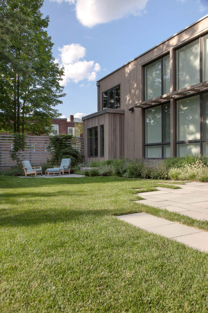 A stunning new home and landscape reinvent a dated ranch-style developer property for outdoor-focused, contemporary living in urban Brookline, near the Emerald Necklace and Fenway Park. The active family requested a landscape fusing “California-style outdoor living” with New England.