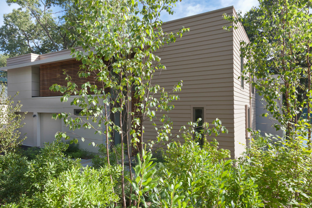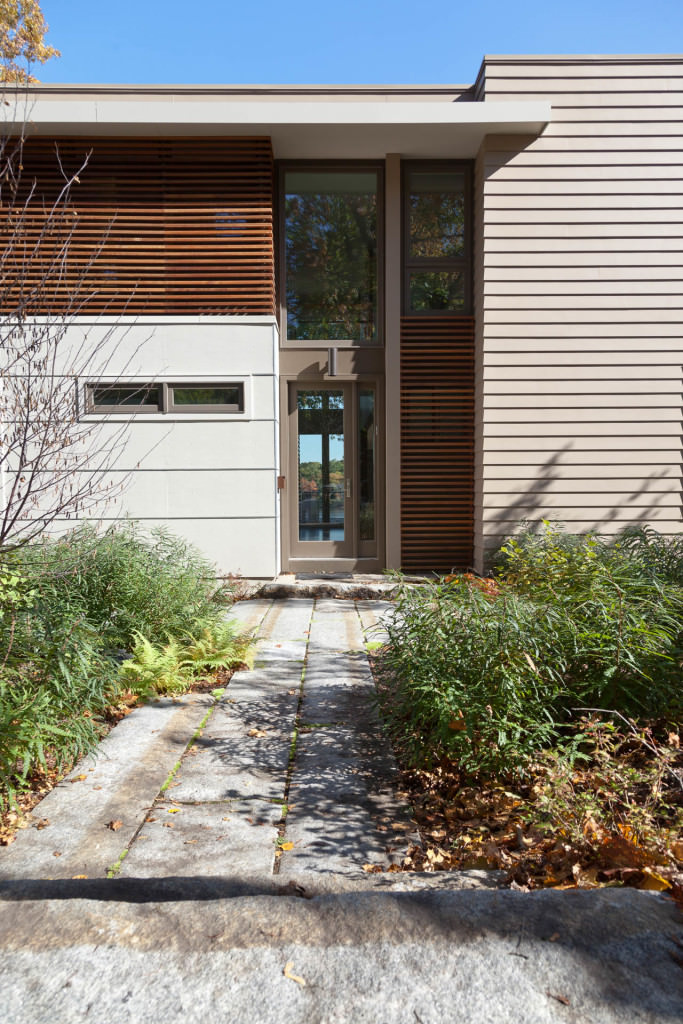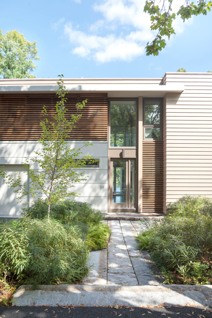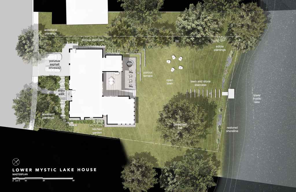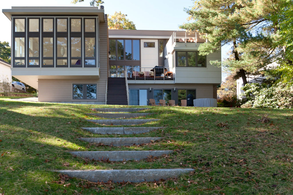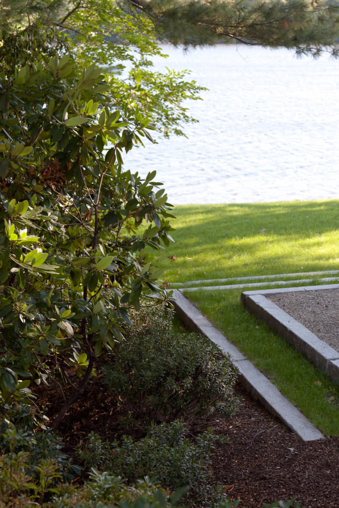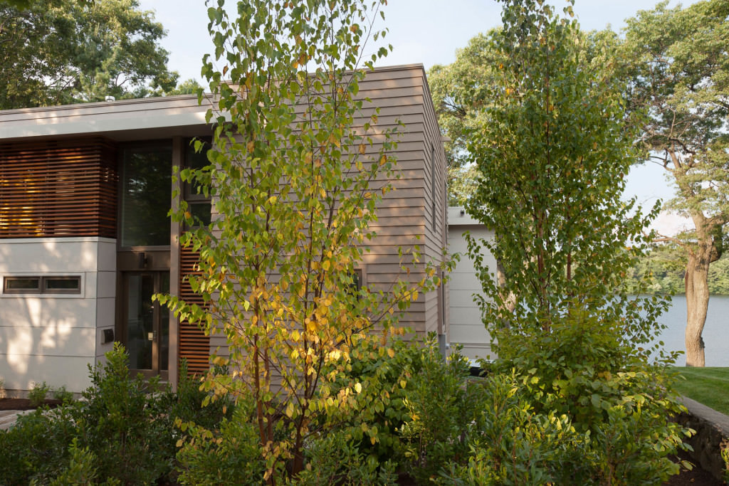 A fantastic new contemporary home and environmentally savvy landscape stand proudly on the edge of a carefully restored waterfront on Lower Mystic Lake in Arlington, Massachusetts. Wonderful slabs of reclaimed granite curbing hand picked by the landscape architect and the clients are adaptively re-used to create an inviting and fresh new front walkway. The same materials are used to construct an elegant stone and lawn staircase that glides from the house to the water on the steeply sloped back yard. Hardscape areas utilize porous paving and water is allowed to return to the local watershed—in the front with permeable asphalt, and in the back with compacted peastone on top of a gravel base. Colonies of drought-tolerant native trees, shrubs, and groundcovers that are found in the local ecology communities surrounding the Lake quickly take hold without the help of a conventional or permanent irrigation system, and the low-maintenance property absolutely erupts with color each autumn.