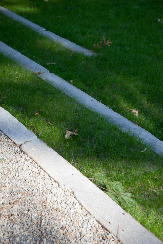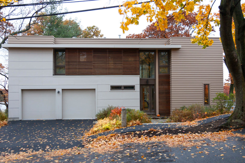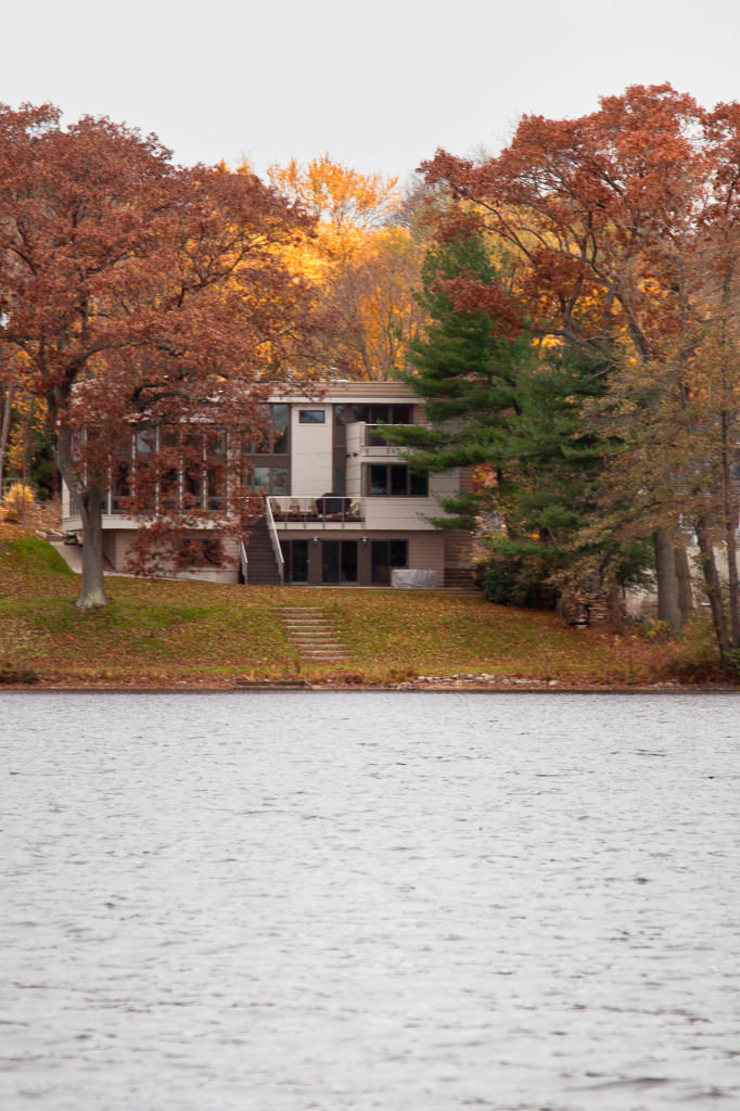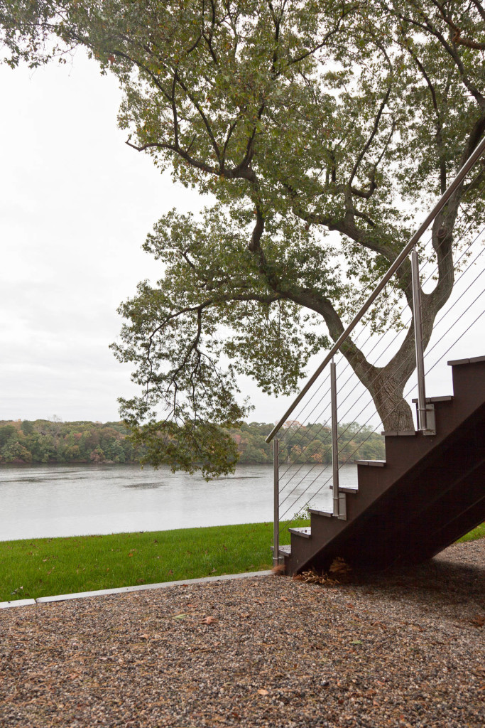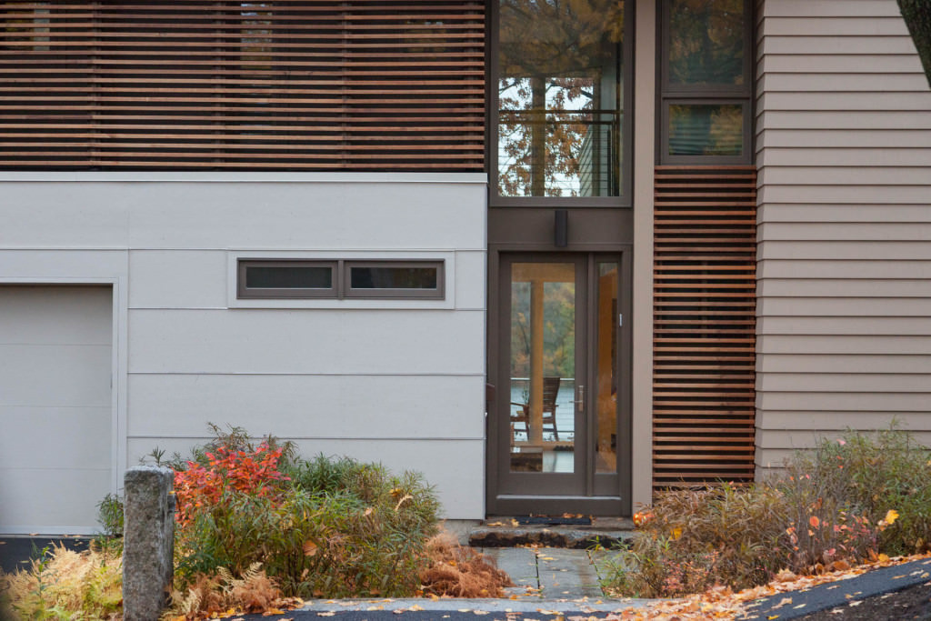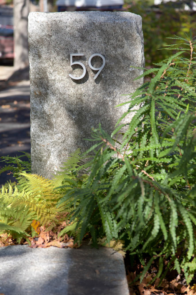 A fantastic new contemporary home and environmentally savvy landscape stand proudly on the edge of a carefully restored waterfront on Lower Mystic Lake in Arlington, Massachusetts. Wonderful slabs of reclaimed granite curbing hand picked by the landscape architect and the clients are adaptively re-used to create an inviting and fresh new front walkway. The same materials are used to construct an elegant stone and lawn staircase that glides from the house to the water on the steeply sloped back yard. Hardscape areas utilize porous paving and water is allowed to return to the local watershed—in the front with permeable asphalt, and in the back with compacted peastone on top of a gravel base. Colonies of drought-tolerant native trees, shrubs, and groundcovers that are found in the local ecology communities surrounding the Lake quickly take hold without the help of a conventional or permanent irrigation system, and the low-maintenance property absolutely erupts with color each autumn.