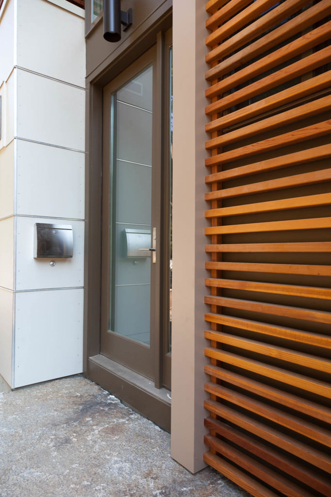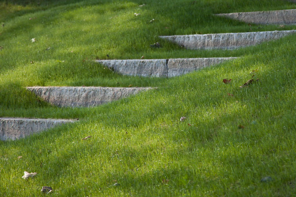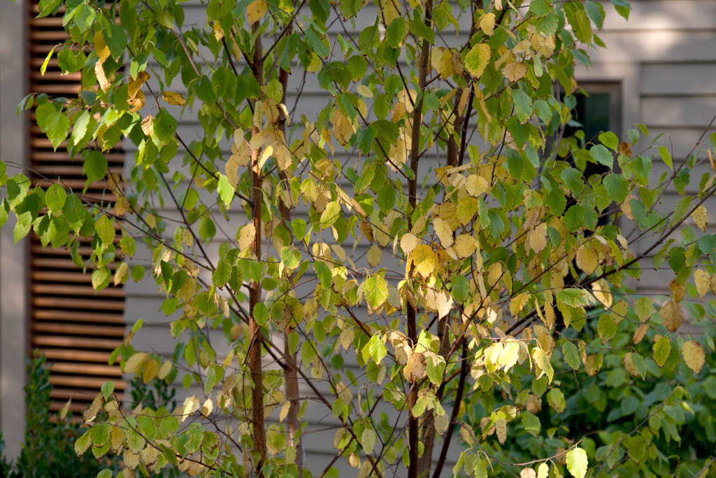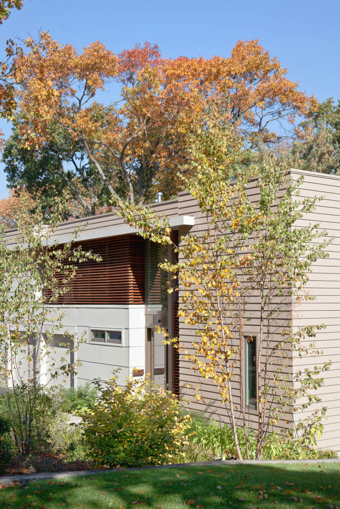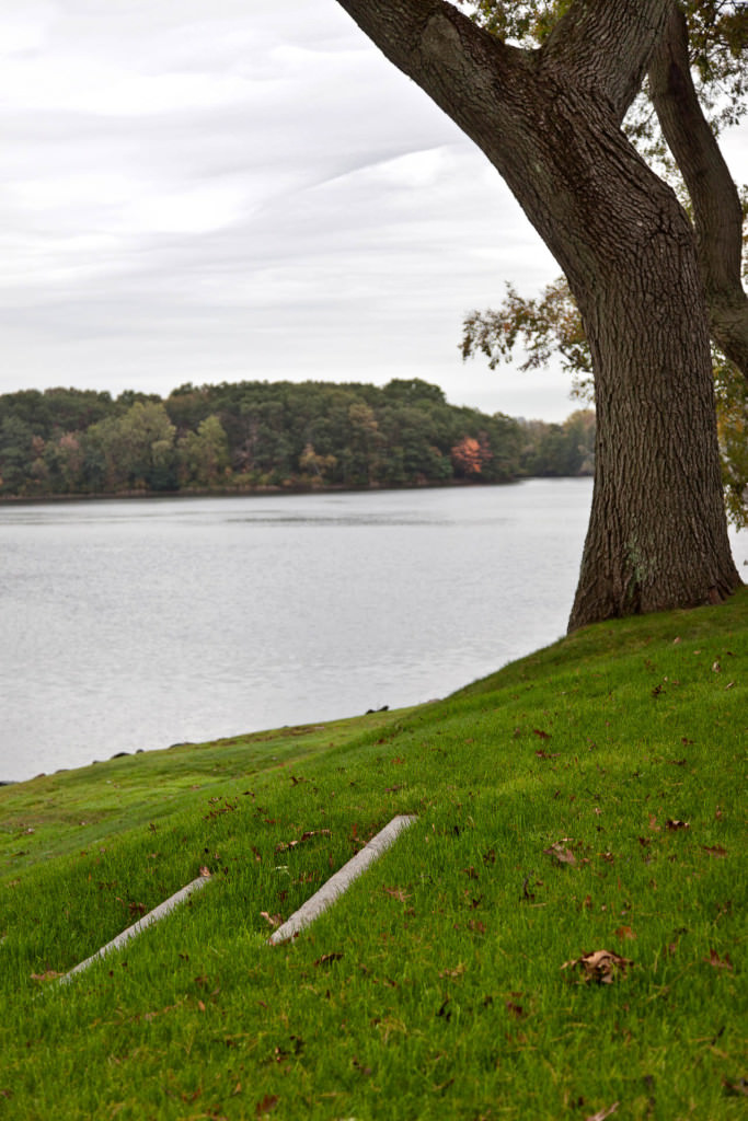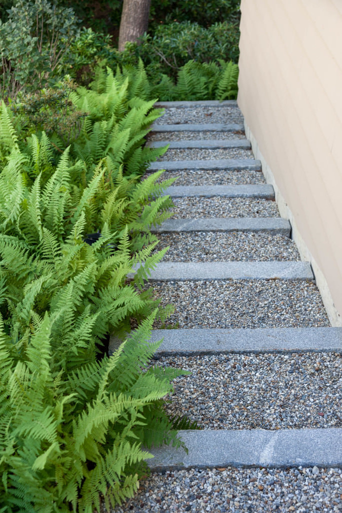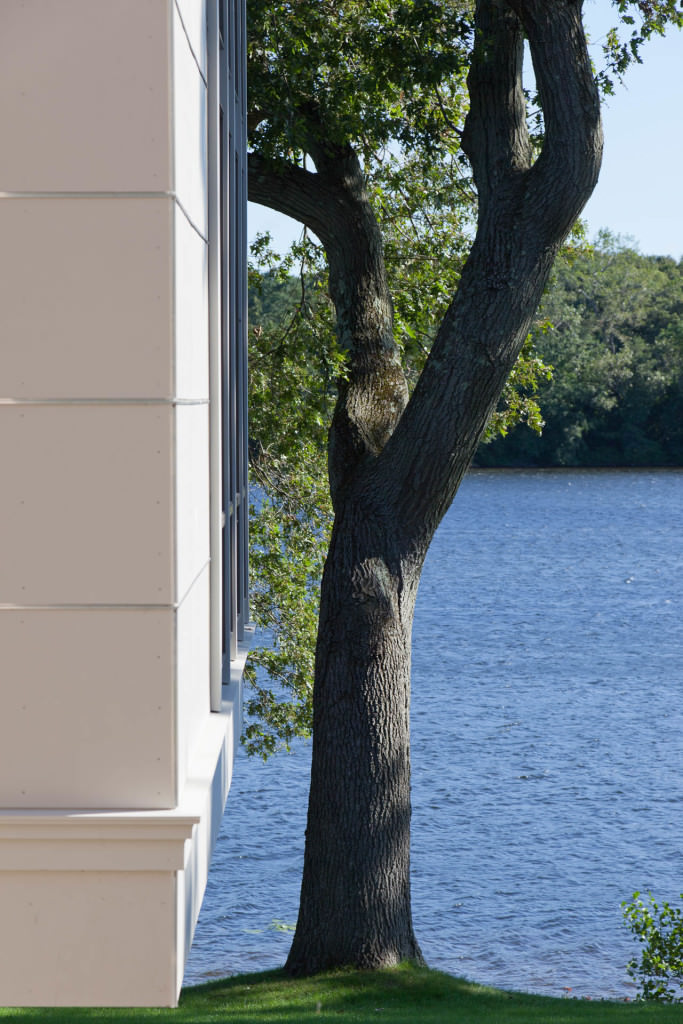 A fantastic new contemporary home and environmentally savvy landscape stand proudly on the edge of a carefully restored waterfront on Lower Mystic Lake in Arlington, Massachusetts. Wonderful slabs of reclaimed granite curbing hand picked by the landscape architect and the clients are adaptively re-used to create an inviting and fresh new front walkway. The same materials are used to construct an elegant stone and lawn staircase that glides from the house to the water on the steeply sloped back yard. Hardscape areas utilize porous paving and water is allowed to return to the local watershed—in the front with permeable asphalt, and in the back with compacted peastone on top of a gravel base. Colonies of drought-tolerant native trees, shrubs, and groundcovers that are found in the local ecology communities surrounding the Lake quickly take hold without the help of a conventional or permanent irrigation system, and the low-maintenance property absolutely erupts with color each autumn.