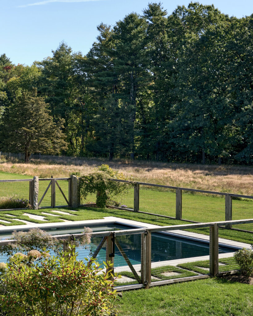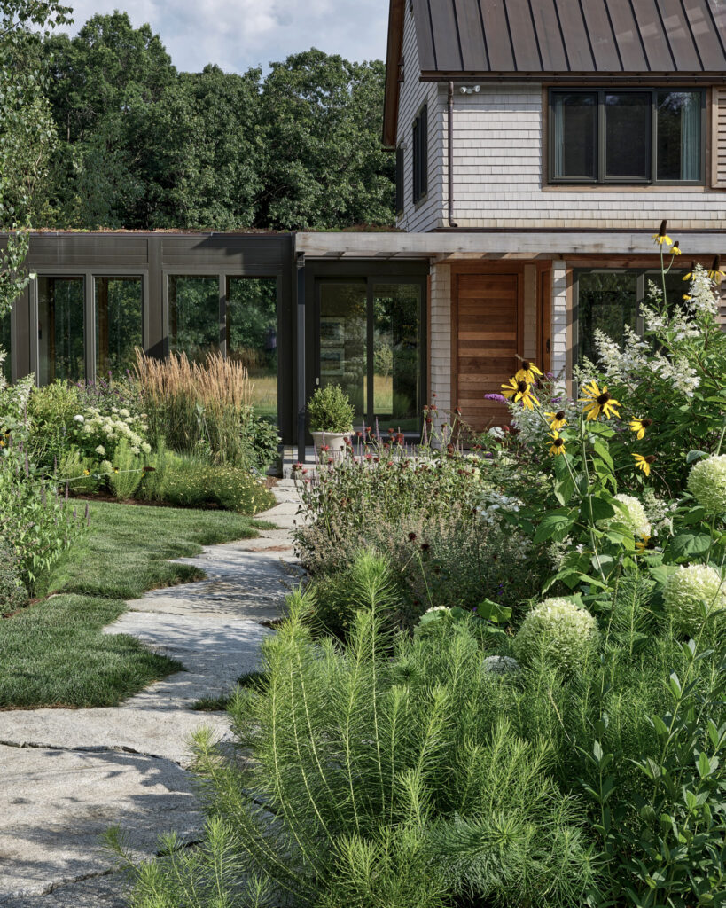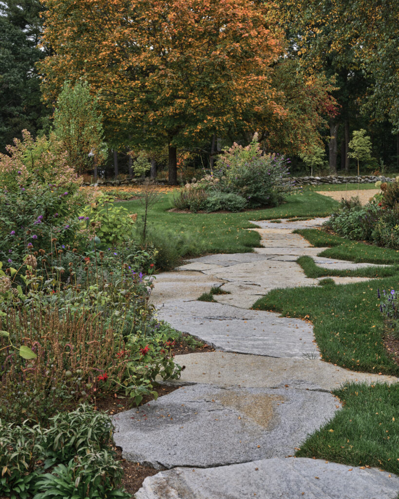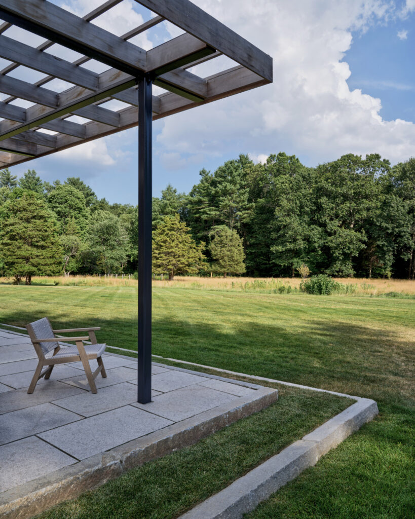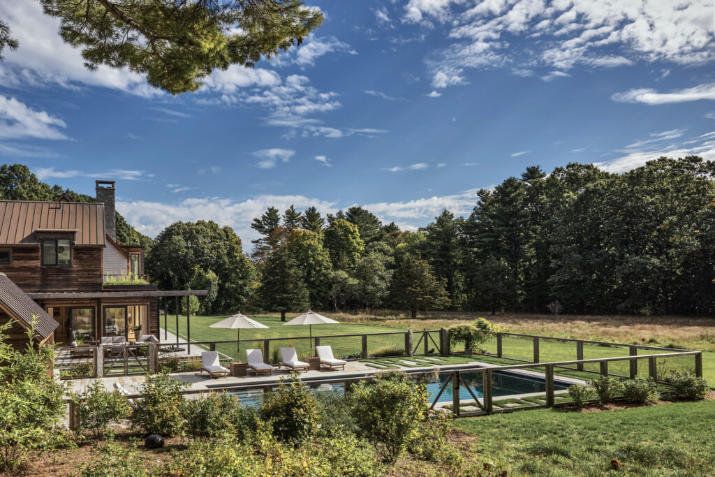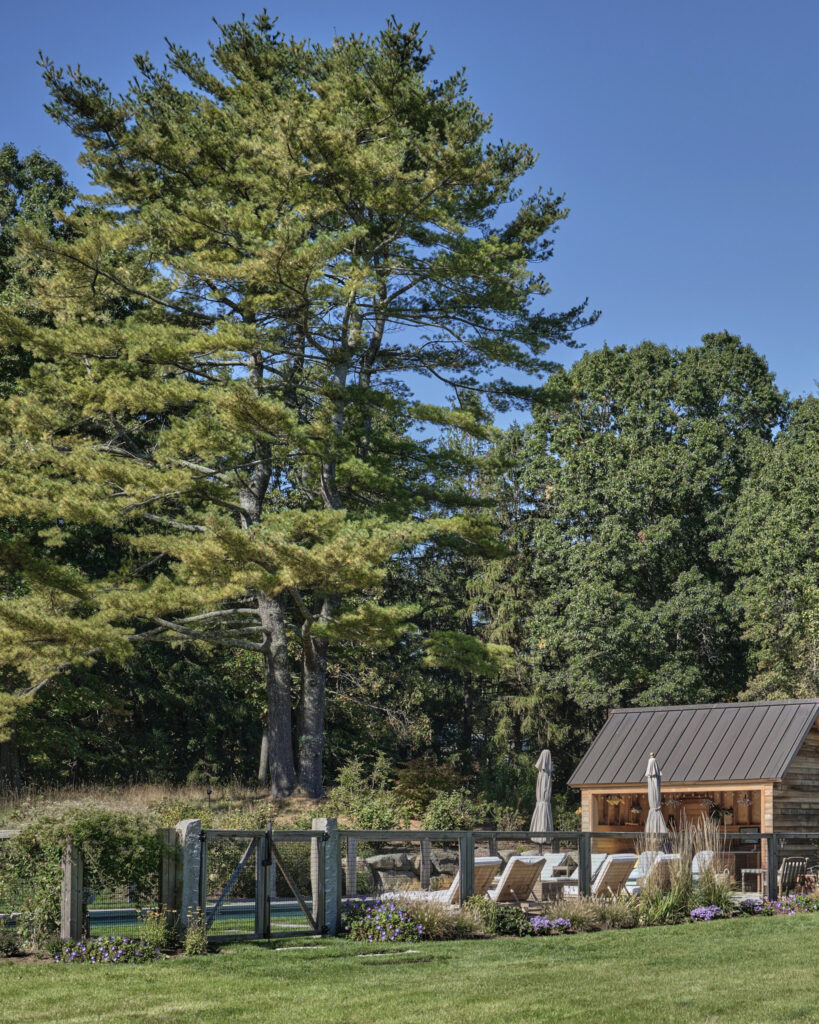 After years in urban London, a Northshore family grew homesick for their familiar rural New England surroundings, so they embarked on building their dream home. The Northshore Meadow House stands proudly upon a gently rolling site, surrounded by lush meadows and dense oak and maple woodlands that are typical of the area. A meandering gravel driveway lined with sugar maples leads through an old field where a new modern farmhouse anchors itself upon the land. A sculptural path built from oversized, rustic slabs of Dodlin Hill granite meanders through beds of colorful, multi-seasonal perennials that are almost always covered with pollinators. Gently rolling lawns provide wide-open space for kids and dogs to soak up all the great parts of country living. An exquisitely crafted reclaimed granite terrace surrounds the sun-drenched pool garden where a grand old pine tree stands watch. Every space on the property boasts sweeping bucolic views of different habitat conditions and wildlife patterns are visible and abundant. There’s something very special about walking around this property on a crisp fall afternoon—your lungs fill with sweet, earthy air and you feel alive.