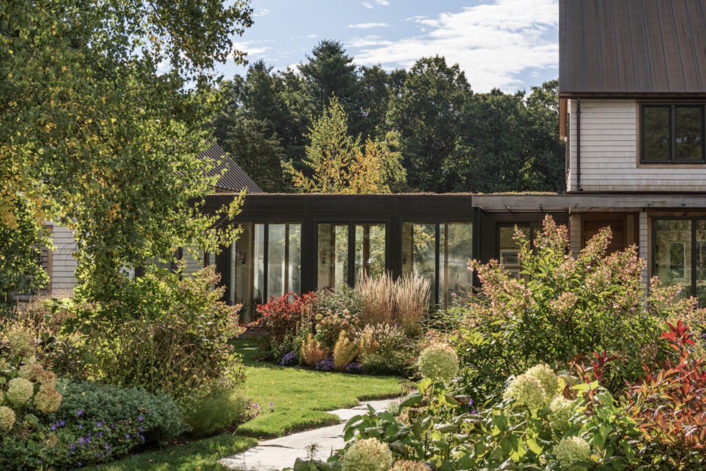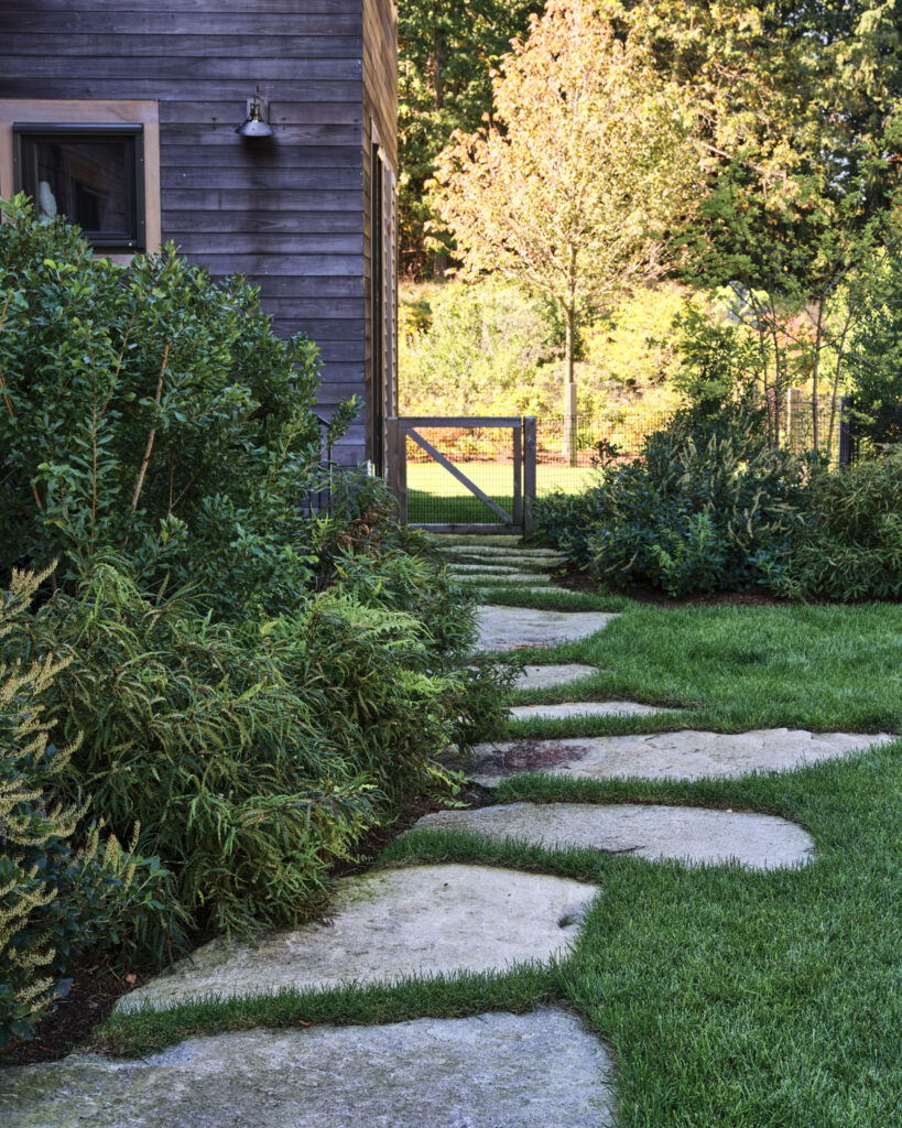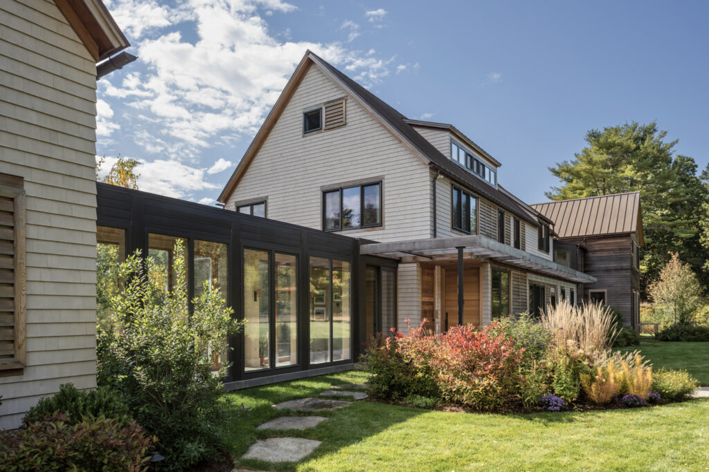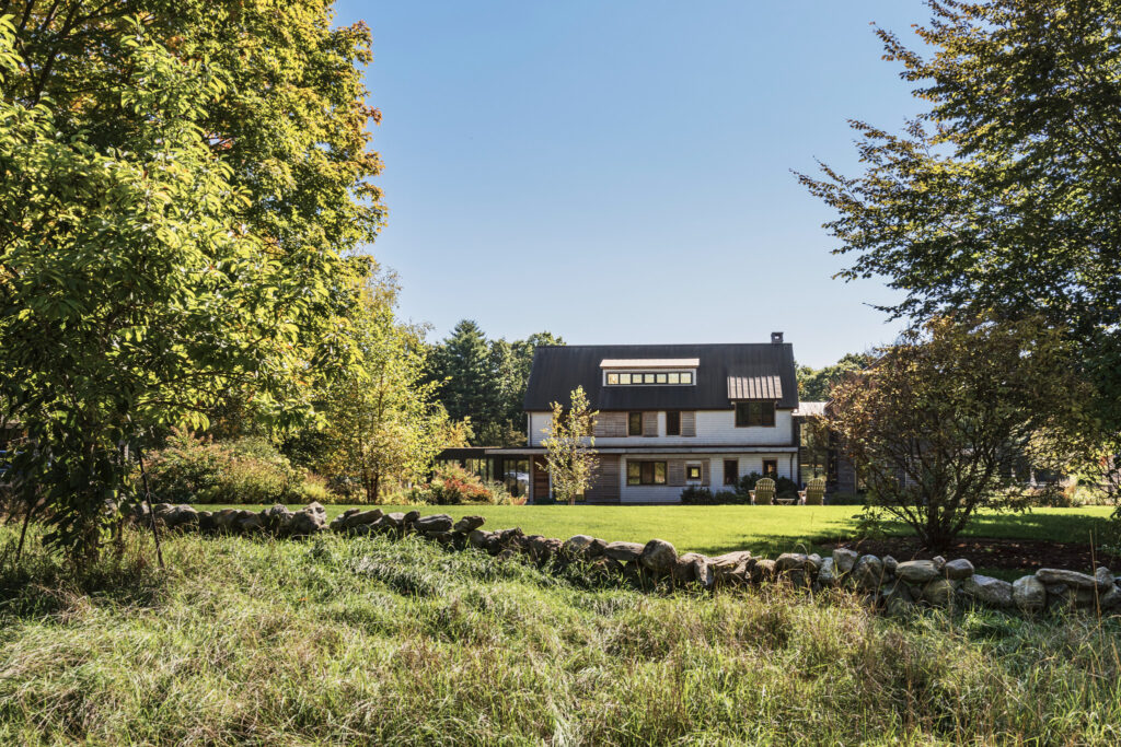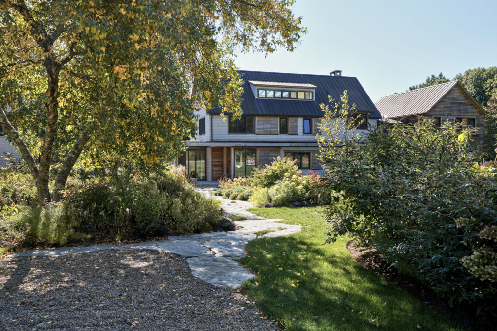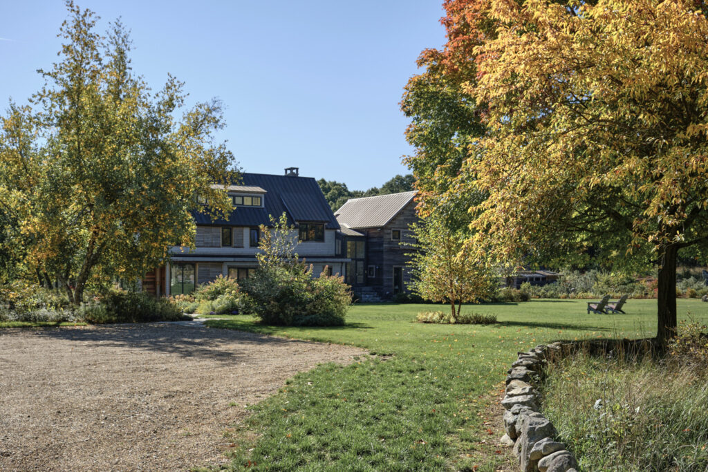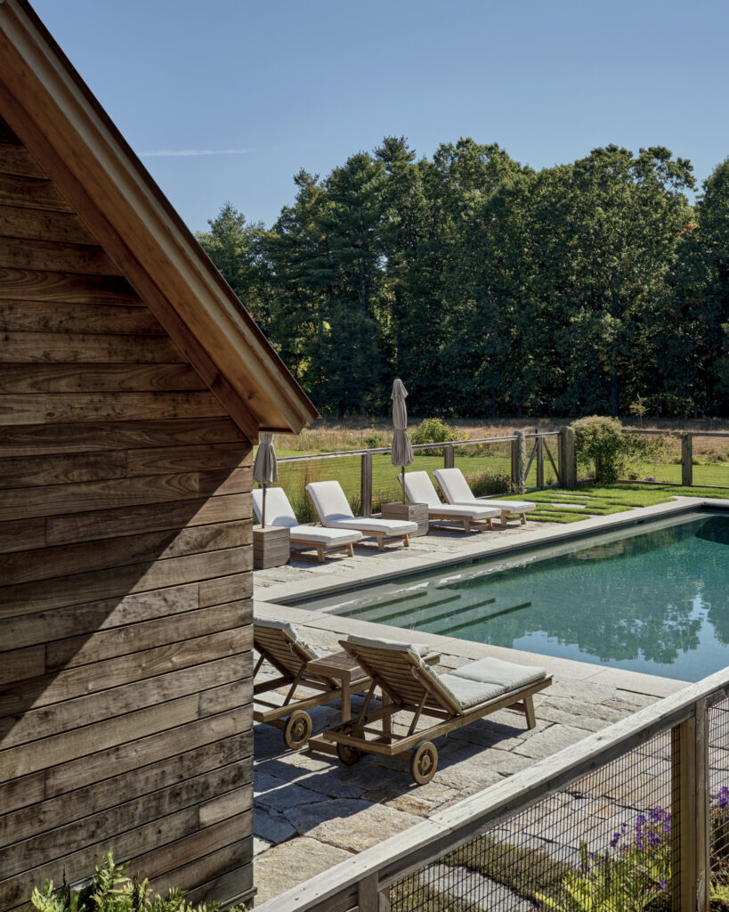 After years in urban London, a Northshore family grew homesick for their familiar rural New England surroundings, so they embarked on building their dream home. The Northshore Meadow House stands proudly upon a gently rolling site, surrounded by lush meadows and dense oak and maple woodlands that are typical of the area. A meandering gravel driveway lined with sugar maples leads through an old field where a new modern farmhouse anchors itself upon the land. A sculptural path built from oversized, rustic slabs of Dodlin Hill granite meanders through beds of colorful, multi-seasonal perennials that are almost always covered with pollinators. Gently rolling lawns provide wide-open space for kids and dogs to soak up all the great parts of country living. An exquisitely crafted reclaimed granite terrace surrounds the sun-drenched pool garden where a grand old pine tree stands watch. Every space on the property boasts sweeping bucolic views of different habitat conditions and wildlife patterns are visible and abundant. There’s something very special about walking around this property on a crisp fall afternoon—your lungs fill with sweet, earthy air and you feel alive.