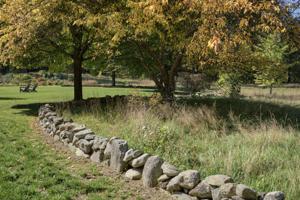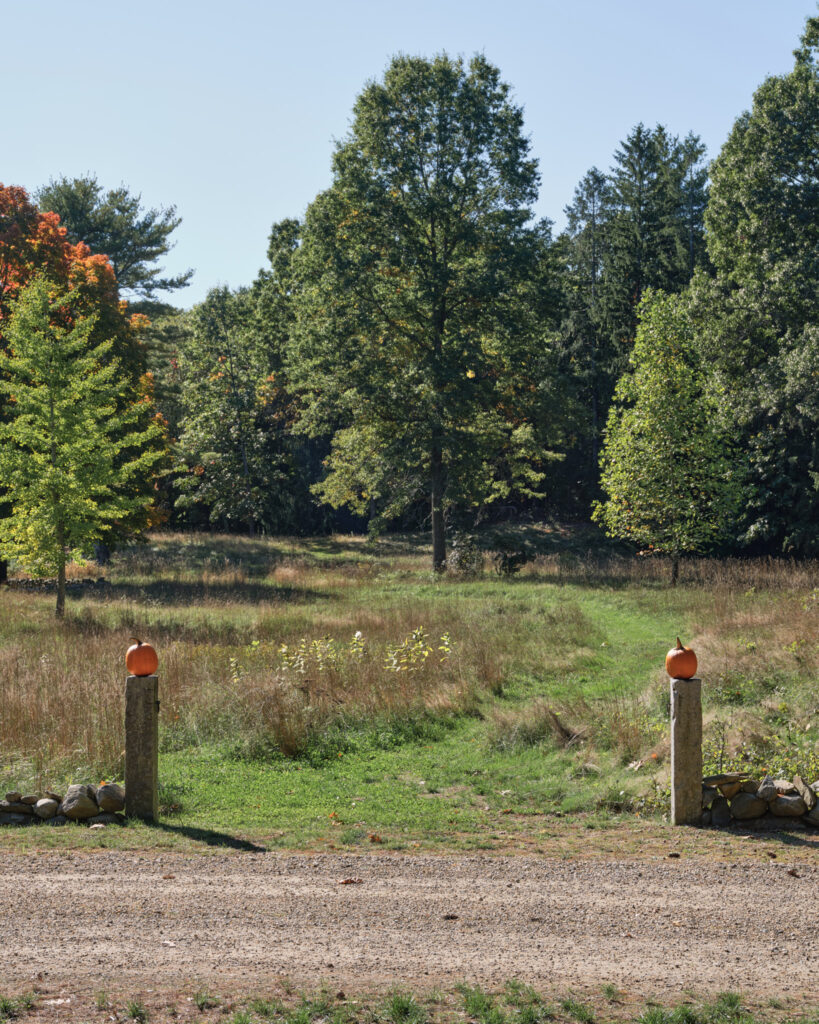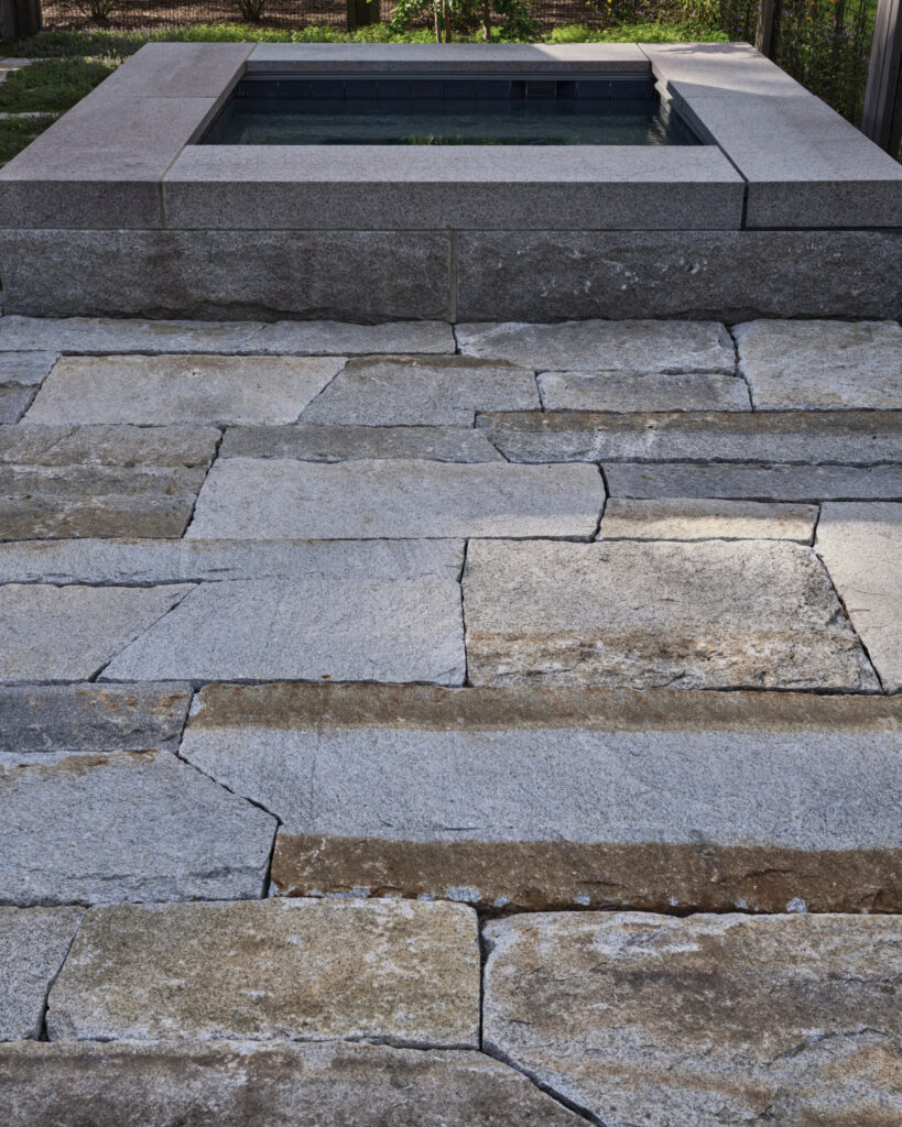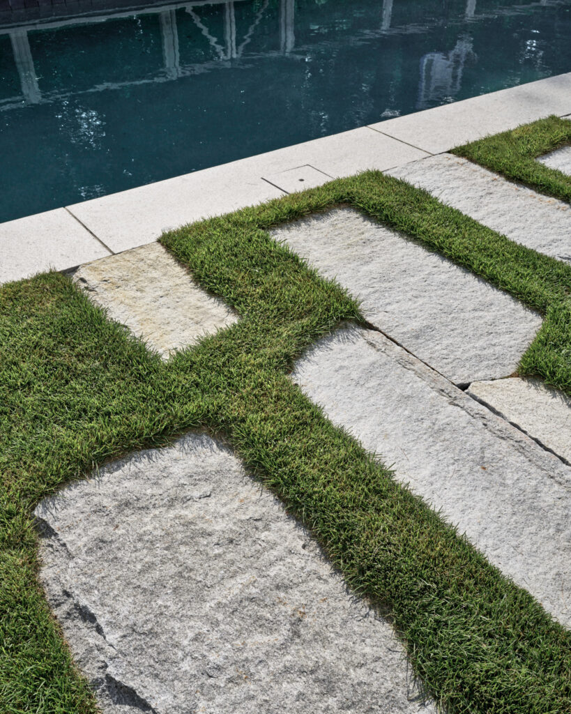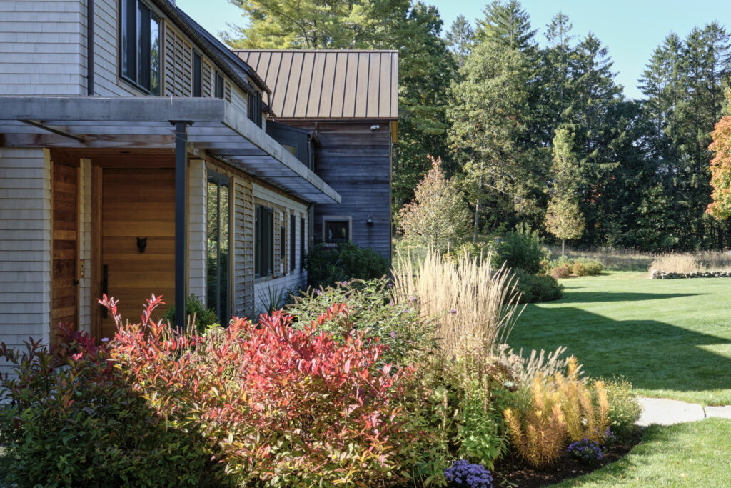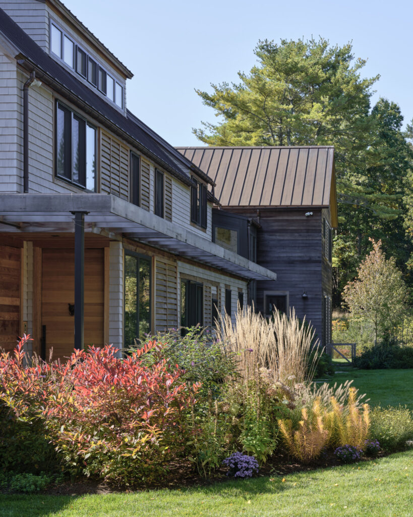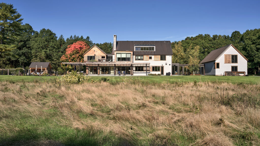 After years in urban London, a Northshore family grew homesick for their familiar rural New England surroundings, so they embarked on building their dream home. The Northshore Meadow House stands proudly upon a gently rolling site, surrounded by lush meadows and dense oak and maple woodlands that are typical of the area. A meandering gravel driveway lined with sugar maples leads through an old field where a new modern farmhouse anchors itself upon the land. A sculptural path built from oversized, rustic slabs of Dodlin Hill granite meanders through beds of colorful, multi-seasonal perennials that are almost always covered with pollinators. Gently rolling lawns provide wide-open space for kids and dogs to soak up all the great parts of country living. An exquisitely crafted reclaimed granite terrace surrounds the sun-drenched pool garden where a grand old pine tree stands watch. Every space on the property boasts sweeping bucolic views of different habitat conditions and wildlife patterns are visible and abundant. There’s something very special about walking around this property on a crisp fall afternoon—your lungs fill with sweet, earthy air and you feel alive.