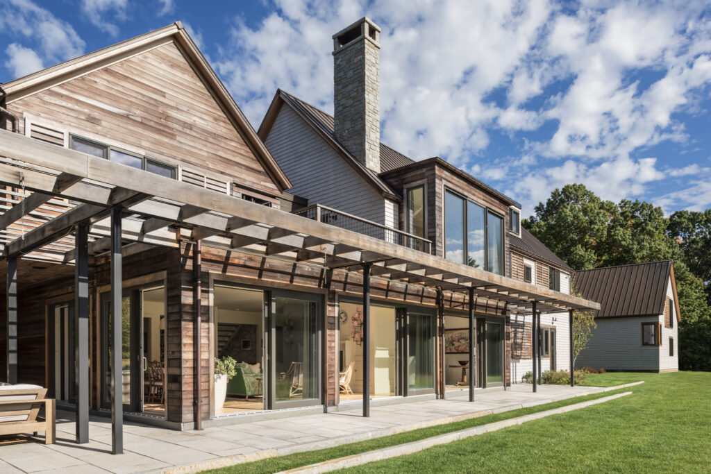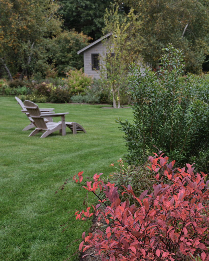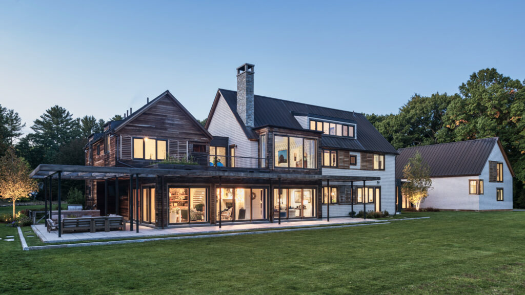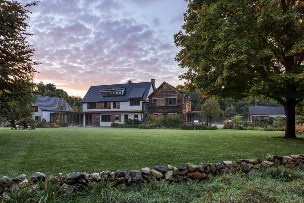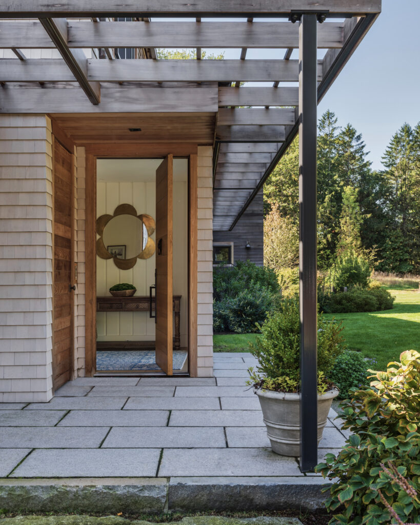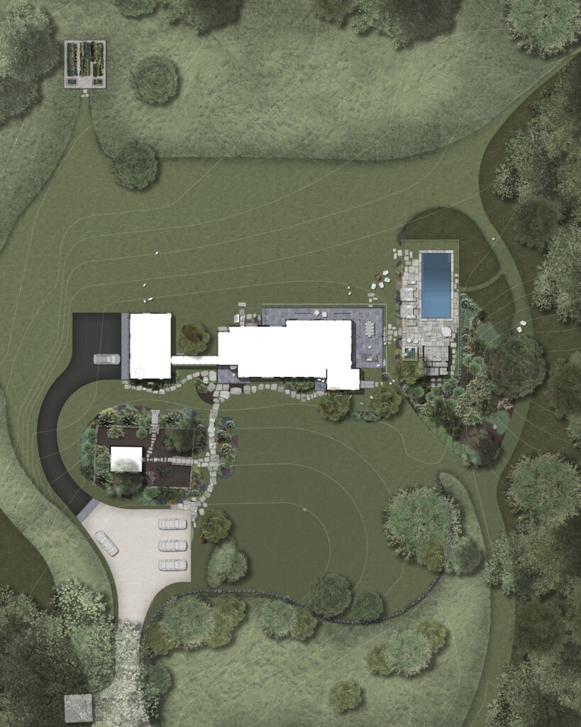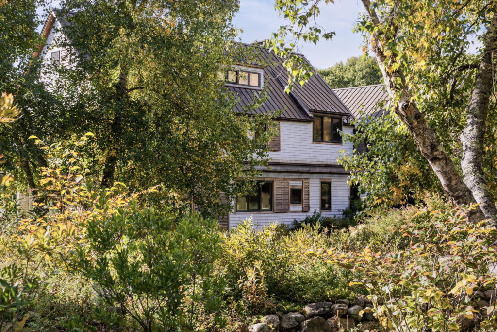 After years in urban London, a Northshore family grew homesick for their familiar rural New England surroundings, so they embarked on building their dream home. The Northshore Meadow House stands proudly upon a gently rolling site, surrounded by lush meadows and dense oak and maple woodlands that are typical of the area. A meandering gravel driveway lined with sugar maples leads through an old field where a new modern farmhouse anchors itself upon the land. A sculptural path built from oversized, rustic slabs of Dodlin Hill granite meanders through beds of colorful, multi-seasonal perennials that are almost always covered with pollinators. Gently rolling lawns provide wide-open space for kids and dogs to soak up all the great parts of country living. An exquisitely crafted reclaimed granite terrace surrounds the sun-drenched pool garden where a grand old pine tree stands watch. Every space on the property boasts sweeping bucolic views of different habitat conditions and wildlife patterns are visible and abundant. There’s something very special about walking around this property on a crisp fall afternoon—your lungs fill with sweet, earthy air and you feel alive.