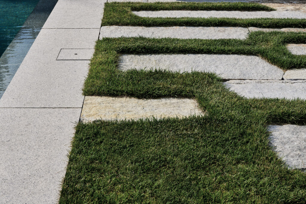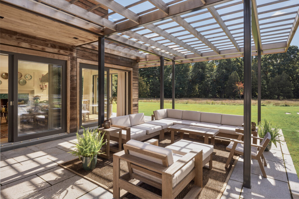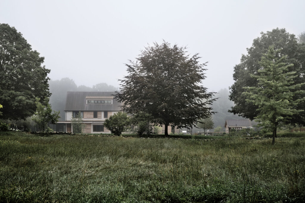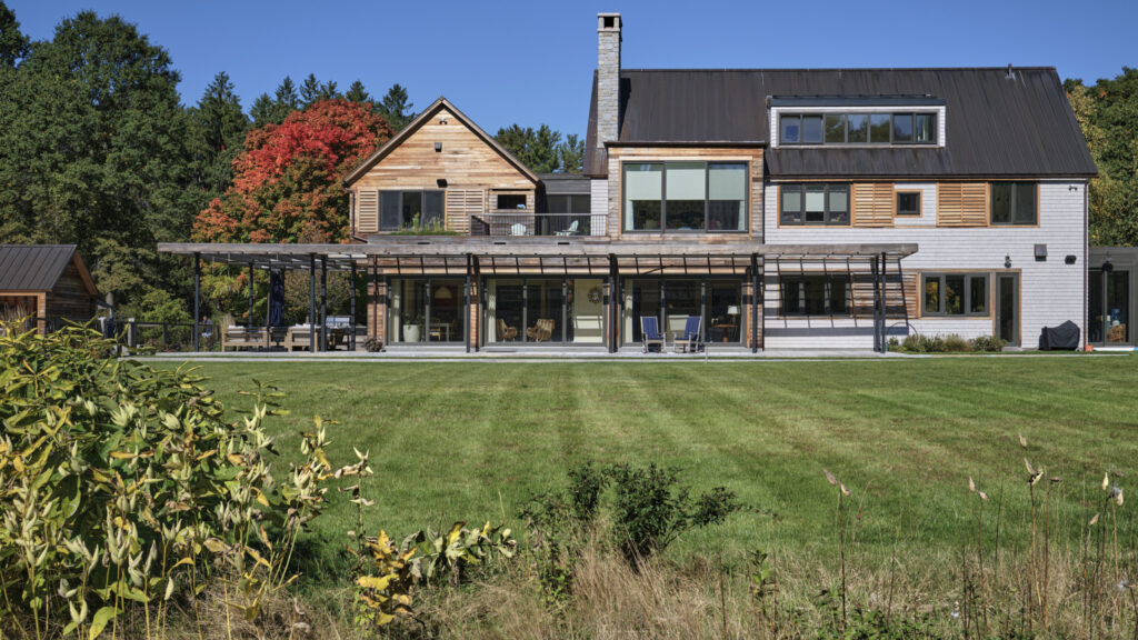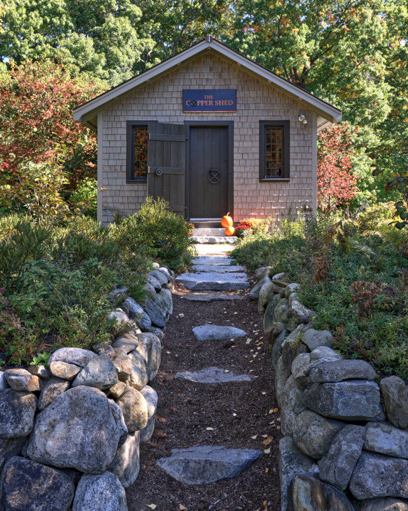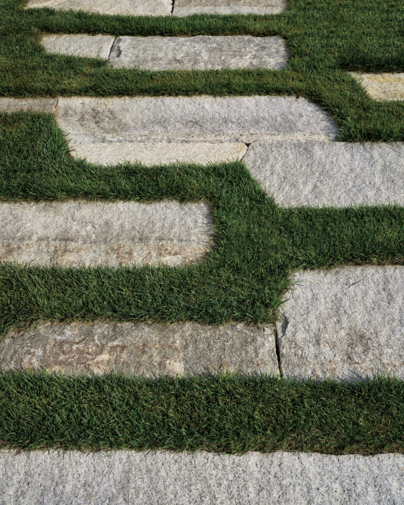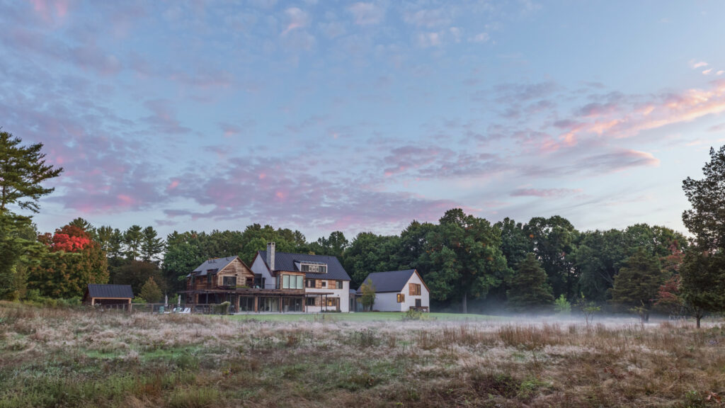 After years in urban London, a Northshore family grew homesick for their familiar rural New England surroundings, so they embarked on building their dream home. The Northshore Meadow House stands proudly upon a gently rolling site, surrounded by lush meadows and dense oak and maple woodlands that are typical of the area. A meandering gravel driveway lined with sugar maples leads through an old field where a new modern farmhouse anchors itself upon the land. A sculptural path built from oversized, rustic slabs of Dodlin Hill granite meanders through beds of colorful, multi-seasonal perennials that are almost always covered with pollinators. Gently rolling lawns provide wide-open space for kids and dogs to soak up all the great parts of country living. An exquisitely crafted reclaimed granite terrace surrounds the sun-drenched pool garden where a grand old pine tree stands watch. Every space on the property boasts sweeping bucolic views of different habitat conditions and wildlife patterns are visible and abundant. There’s something very special about walking around this property on a crisp fall afternoon—your lungs fill with sweet, earthy air and you feel alive.
