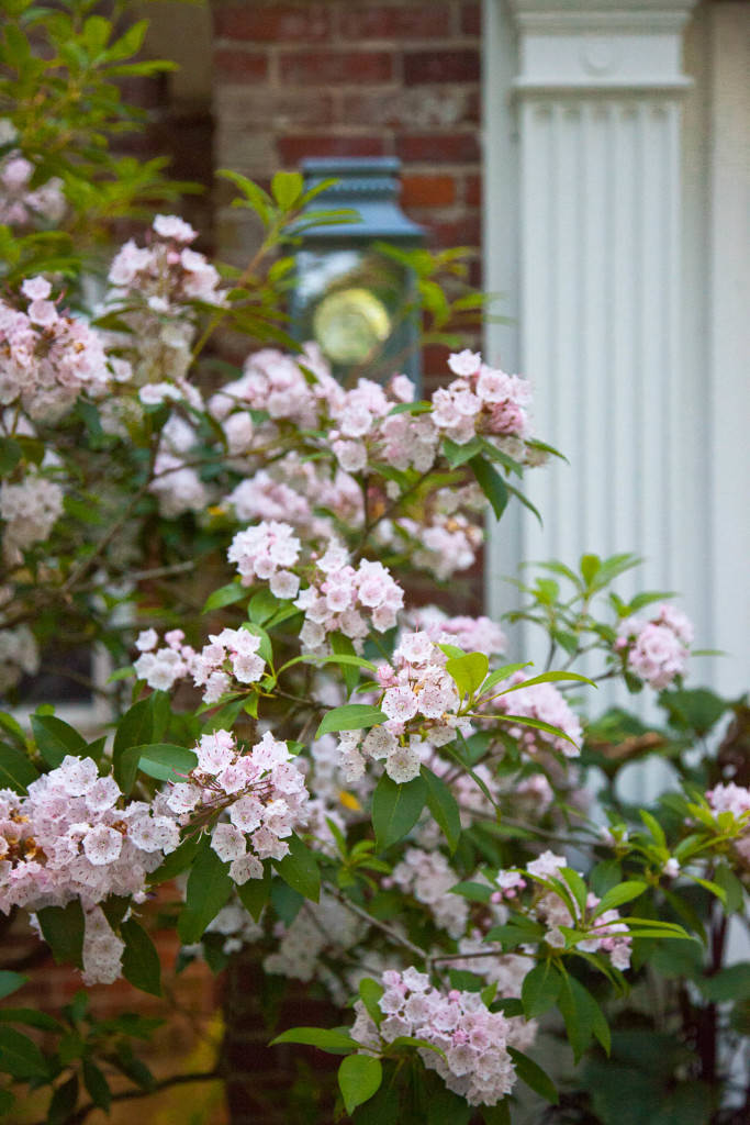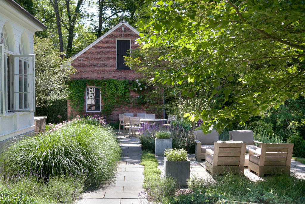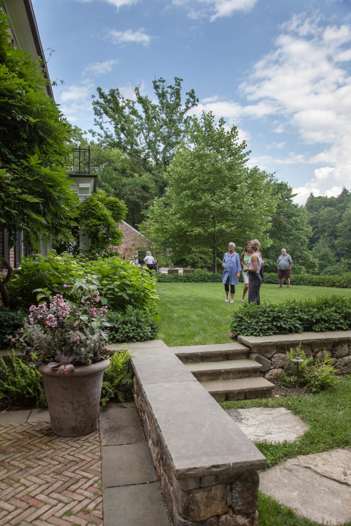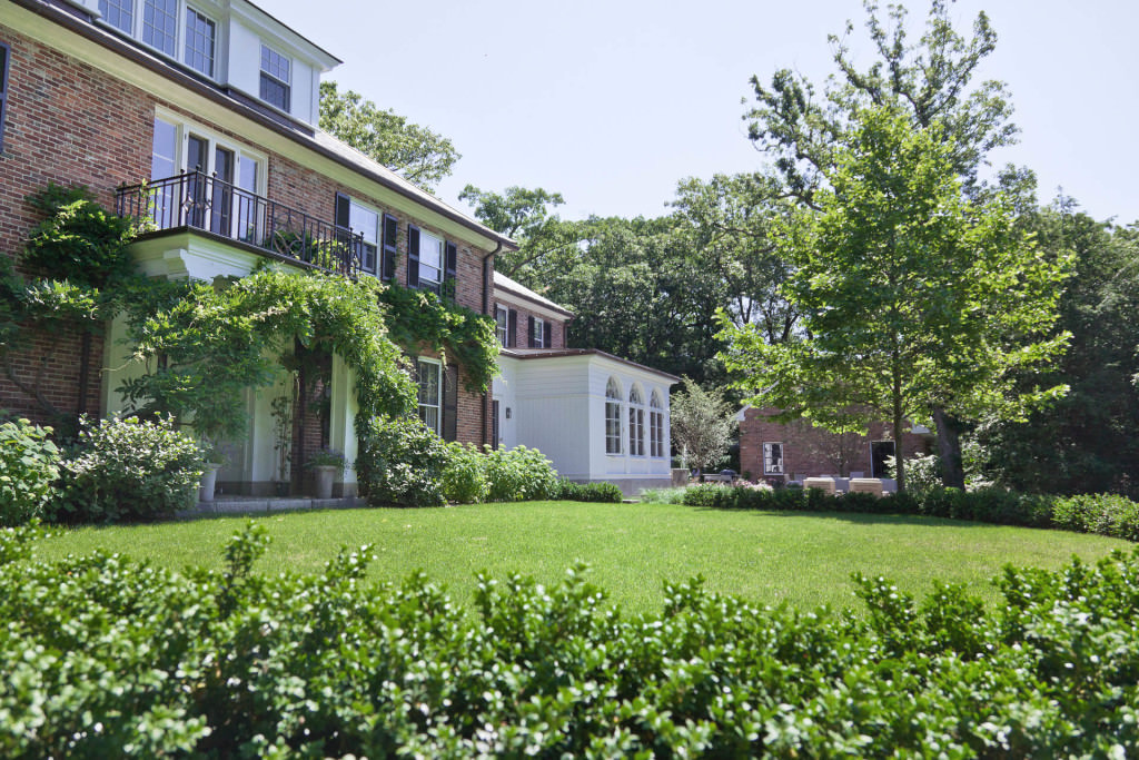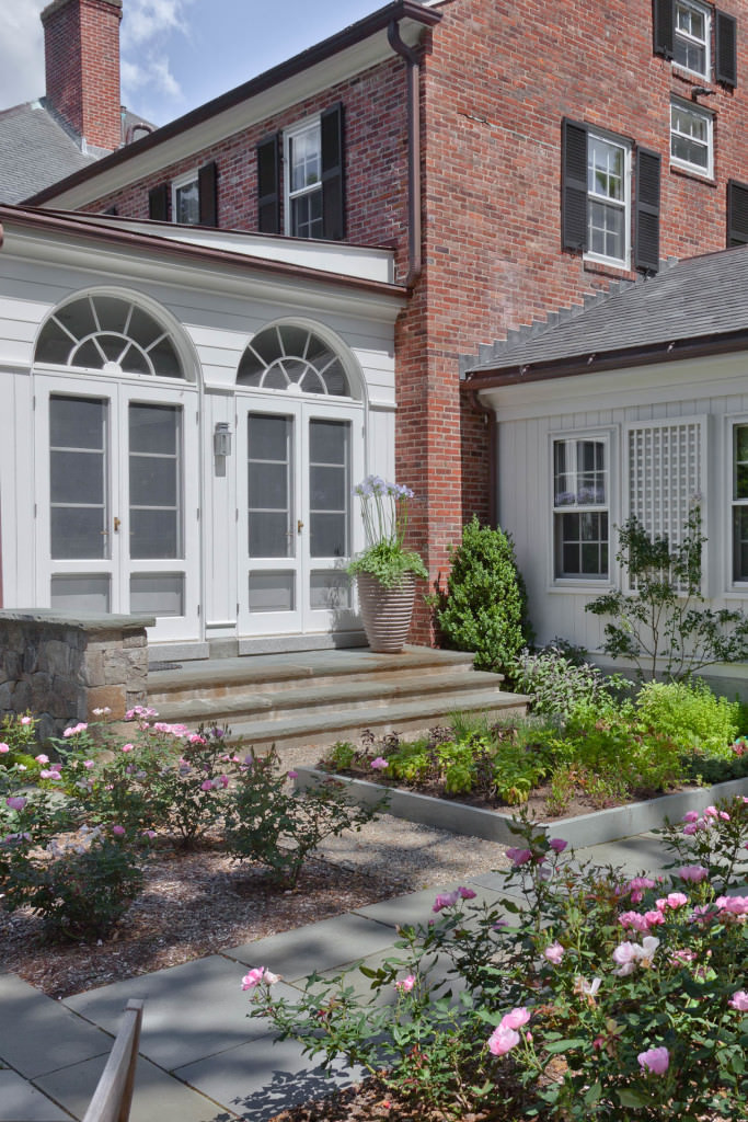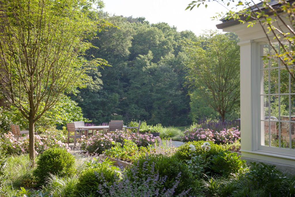 The scale of the home’s formal entries is complemented by the thoughtful arrangement of mature, broadleaf evergreens, and casual drifts of shade-loving woodland perennials and groundcovers create a sublime sense of arrival beneath the canopies of existing preserved dogwoods. New stone, brick, and cobble walkways surrounded by flowing masses of durable, fragrant perennials, lead to separate sitting and dining terraces positioned to absorb and frame dramatic views of the property. A kitchen garden, abundant with herbs, becomes a fulfilling domestic amenity, and rose beds replete with ever-blooming knockout hybrids create an exquisite setting for entertainment and relaxation.