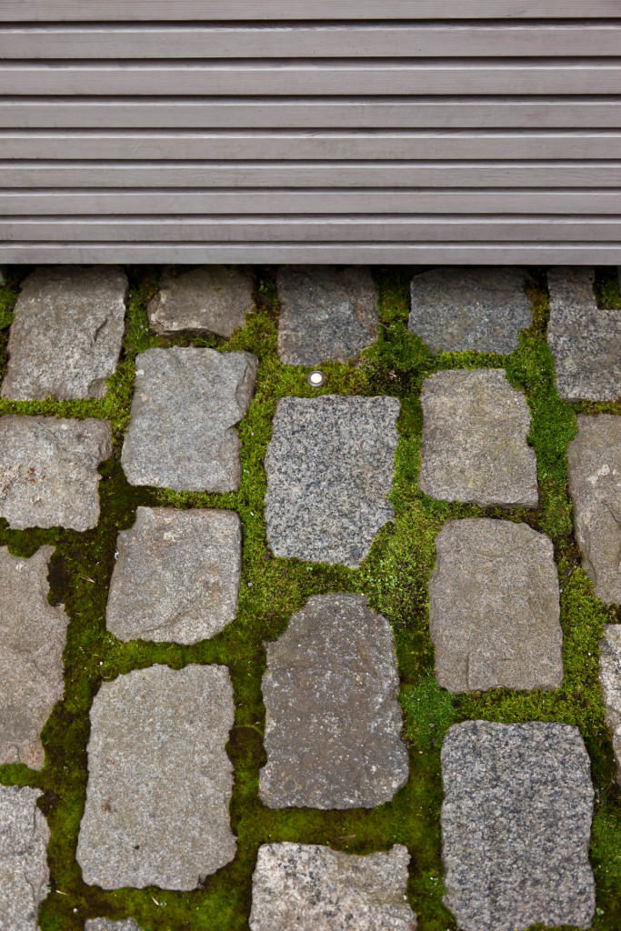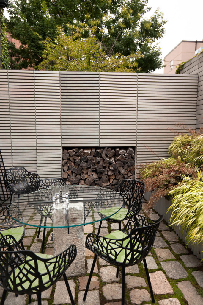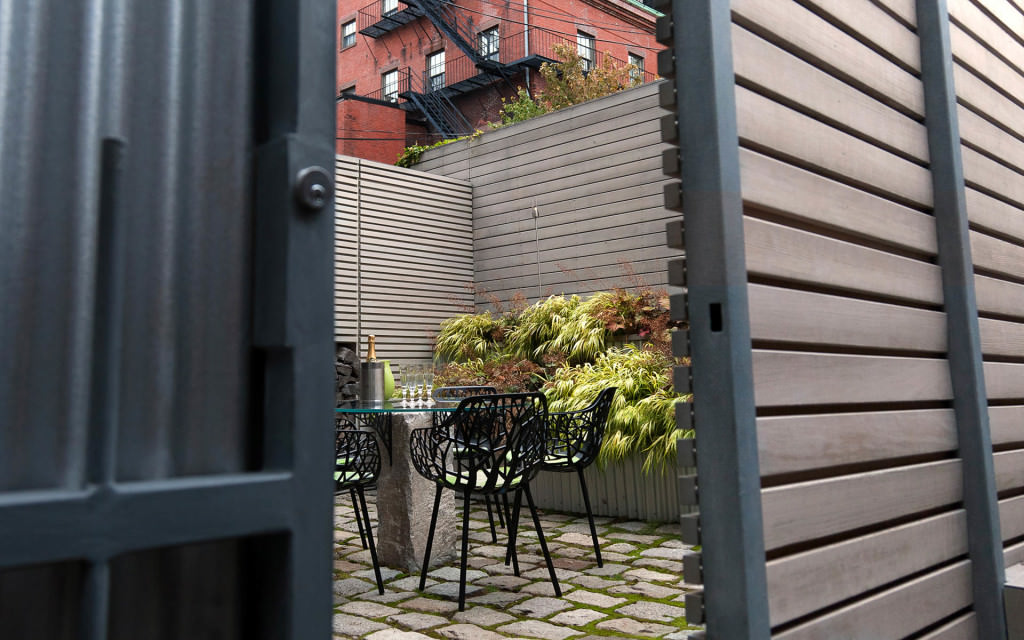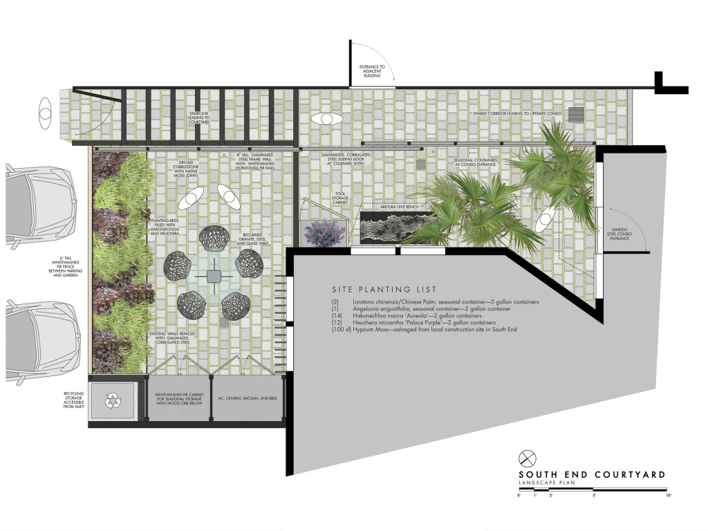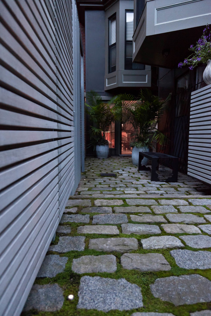 Historic Boston rises above a contemporary private courtyard in the city’s South End. Steel-framed, whitewashed fir walls enclose a vibrant, durable garden. Innovative storage solutions make efficient use of limited space. Soothing geometric patterns visually extend the volume of the courtyard, and bright plantings punctuate the landscape. Native moss joints create a soft, porous carpet between antique cobblestones. A salvaged Maine granite pier rises from the earth to form the pedestal of a table––the centerpiece of the garden. Interior and exterior spaces blend to expand urban living.